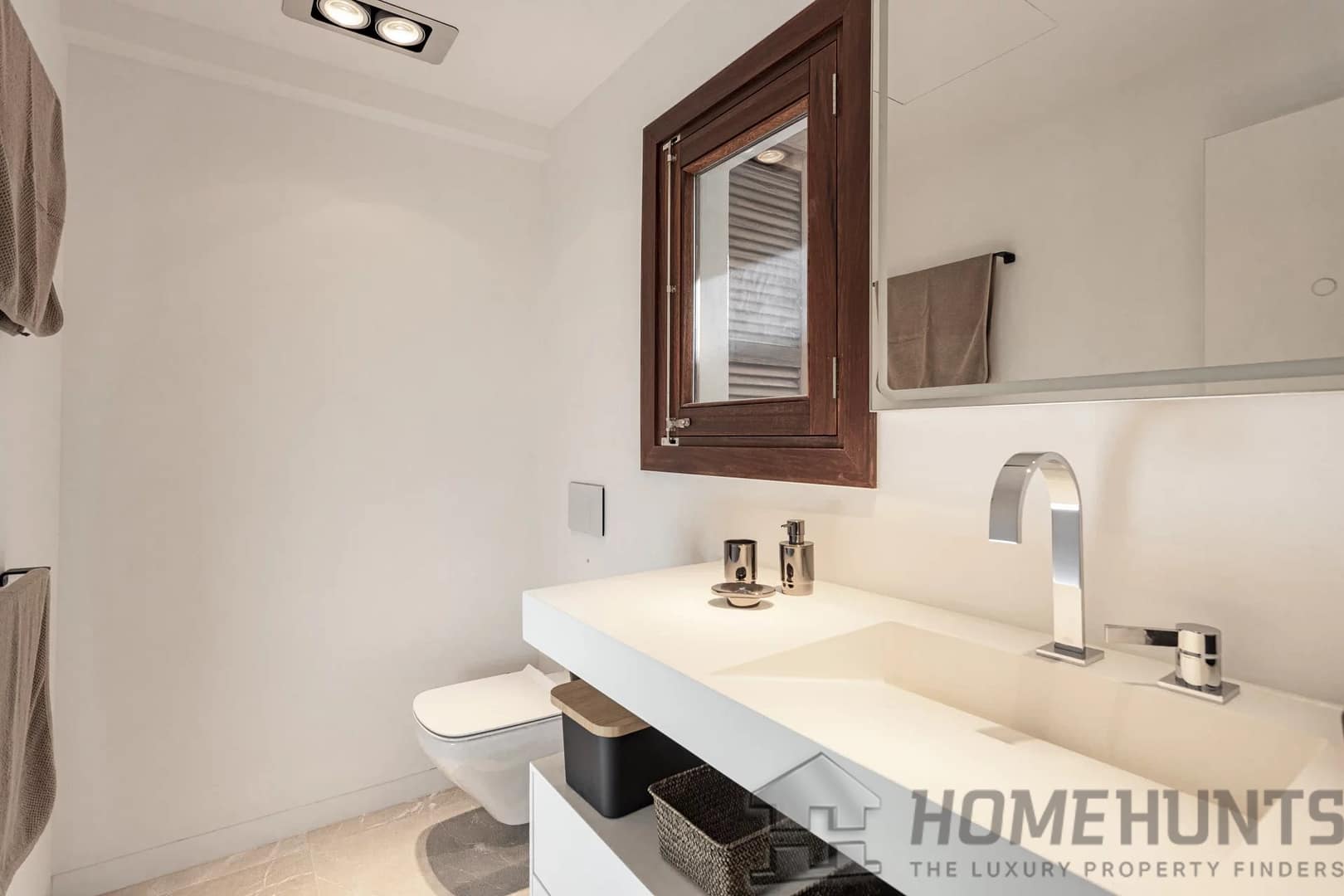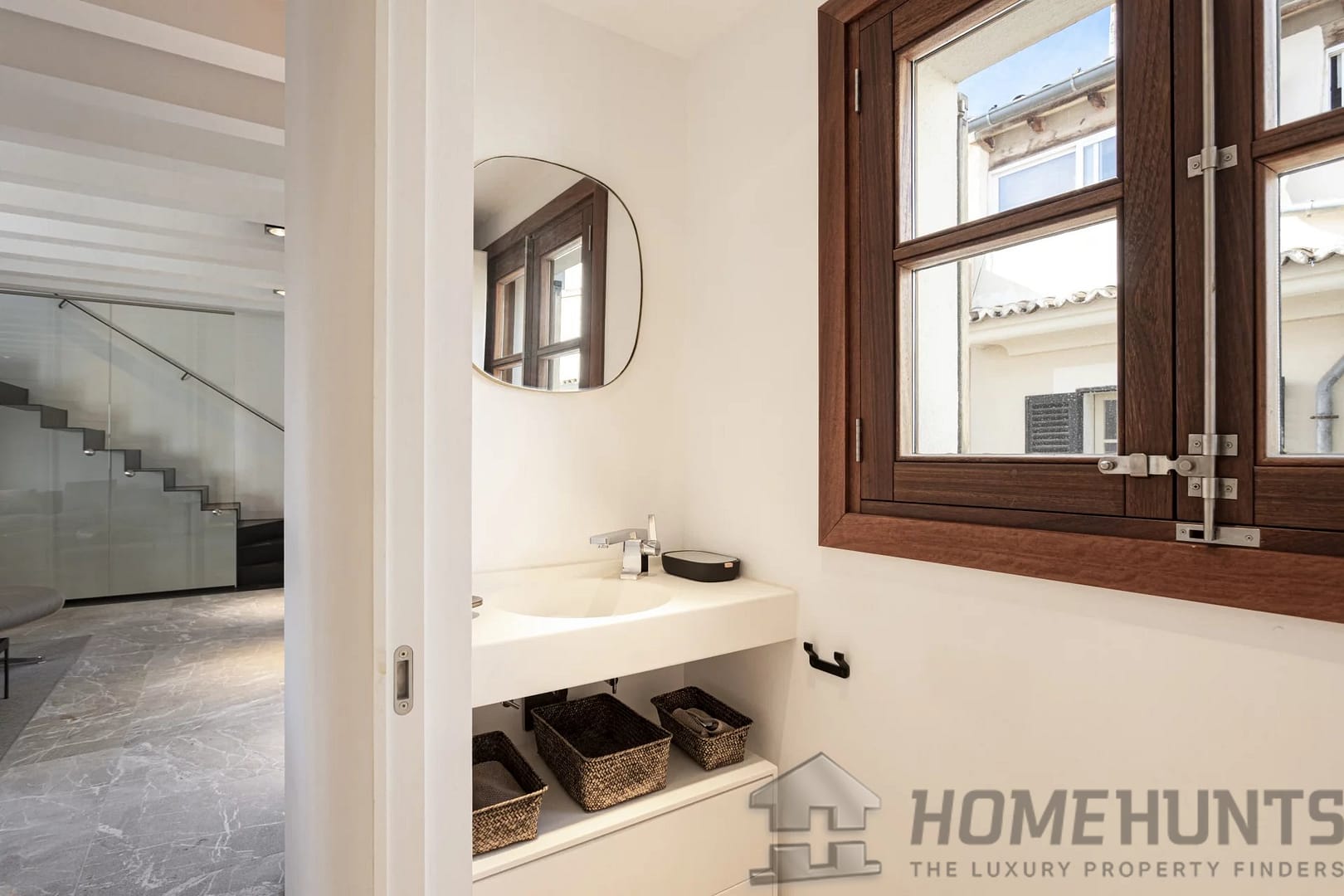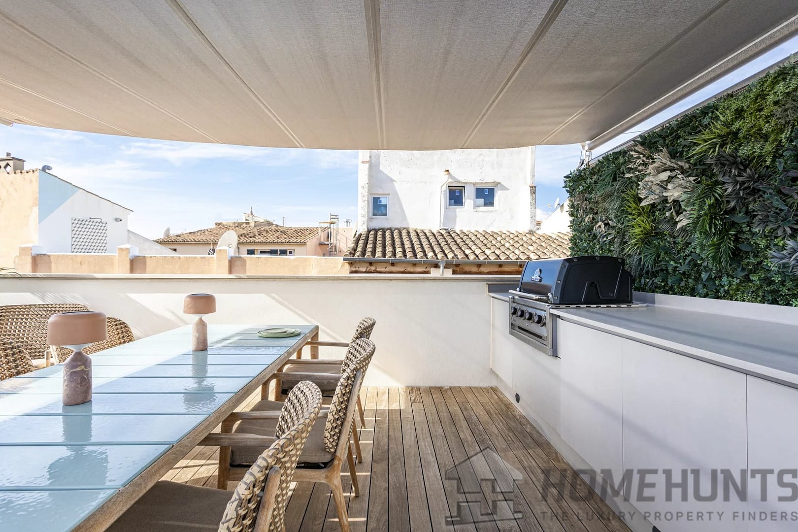 The upper level features a refined living area with a guest toilet and an internal staircase leading to the spectacular private rooftop terrace of approximately 30 m2, complete with an outdoor kitchen, barbecue, and awning – the perfect setting to enjoy Mediterranean living, from sun-soaked afternoons to al-fresco dinners under Palma’s sky.