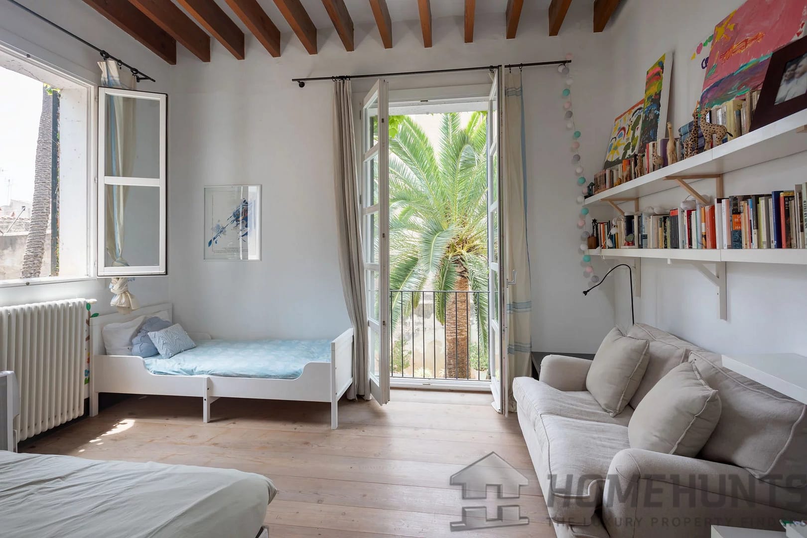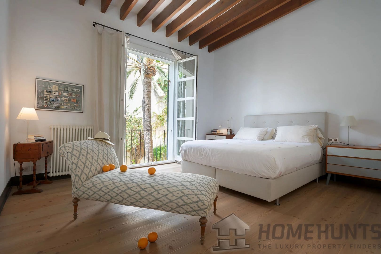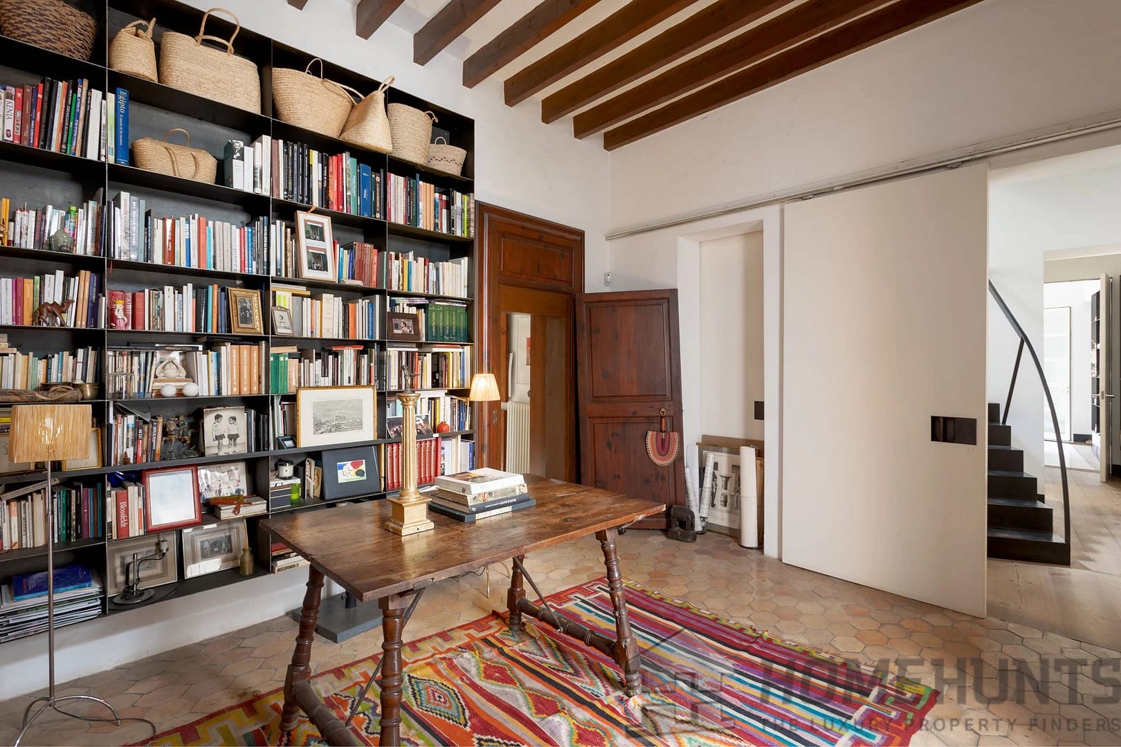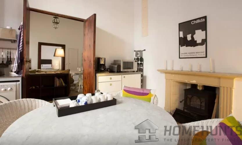 Authentic features such as Mallorcan wooden doors and windows, exposed wooden beams, and gas radiators preserve the property’s character.