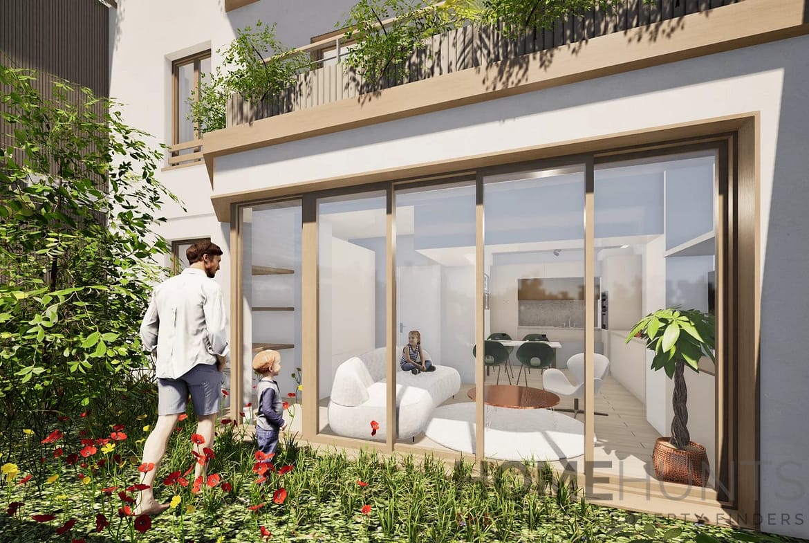 The apartment comprises an entrance hall, a living room with open-plan fitted kitchen opening onto a 32.35 m2 private garden, two bedrooms, a bathroom, and separate WC. The property also benefits from large bike/stroller storage on the ground floor and cellars accessible via elevator in the basement.