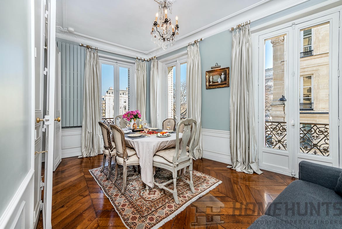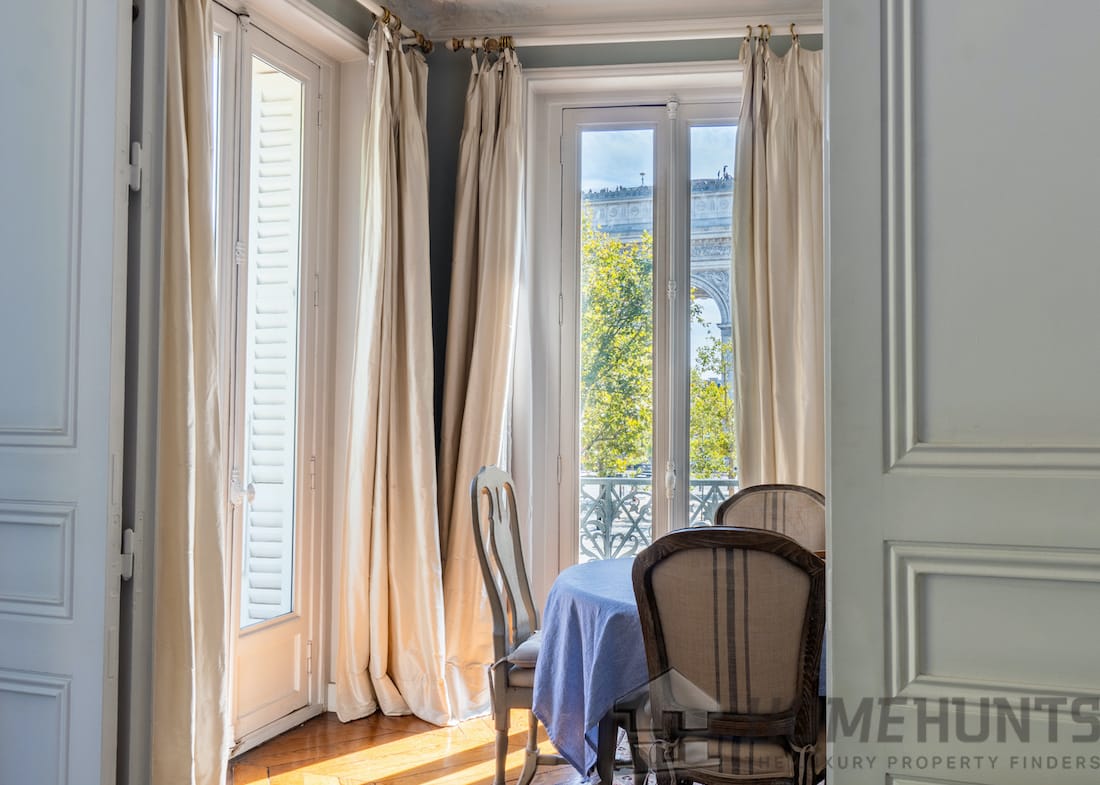 Fully renovated with high-quality materials, the elegant property combines Parisian charm with modern comforts. The corner dining room with a balcony overlooks the Arc de Triomphe, providing stunning views both day and night, and the terrace provides ample space for outdoor dining.