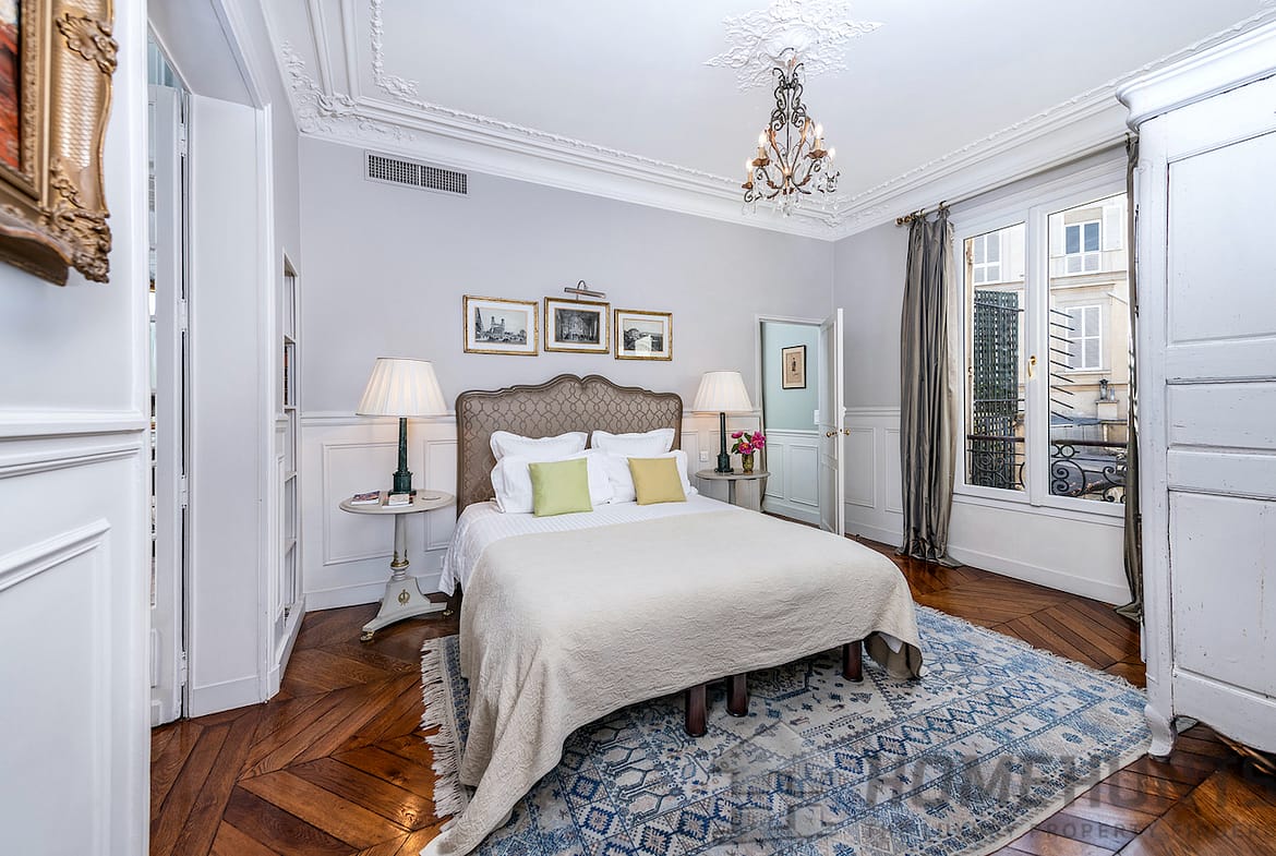 Traditional Parisian elements abound, including French doors, high ceilings, floor-to-ceiling windows, herringbone hardwood flooring throughout, ornate molding, chandeliers, and a fireplace.