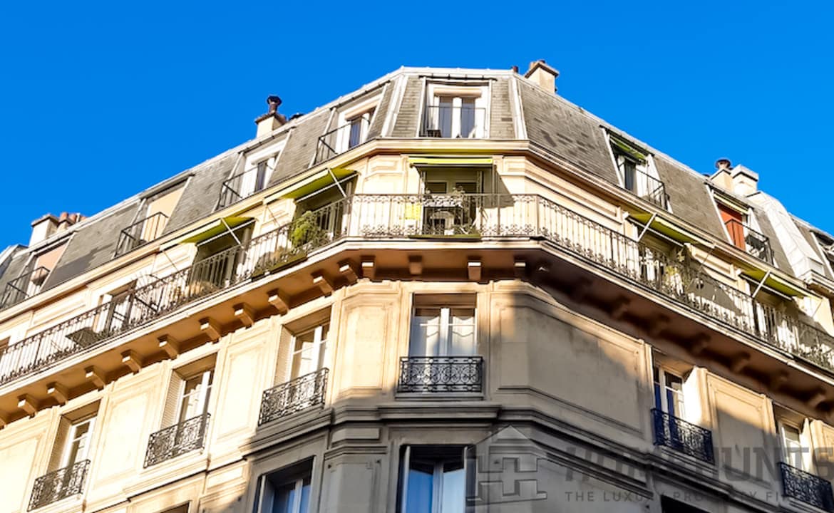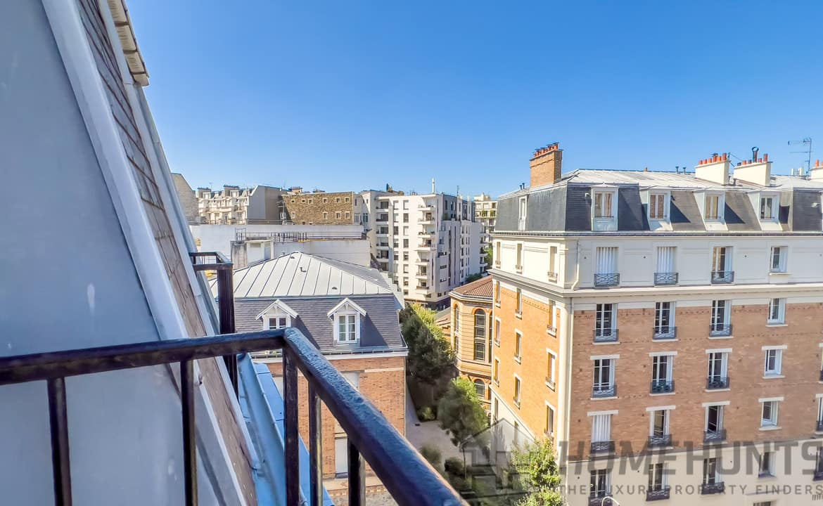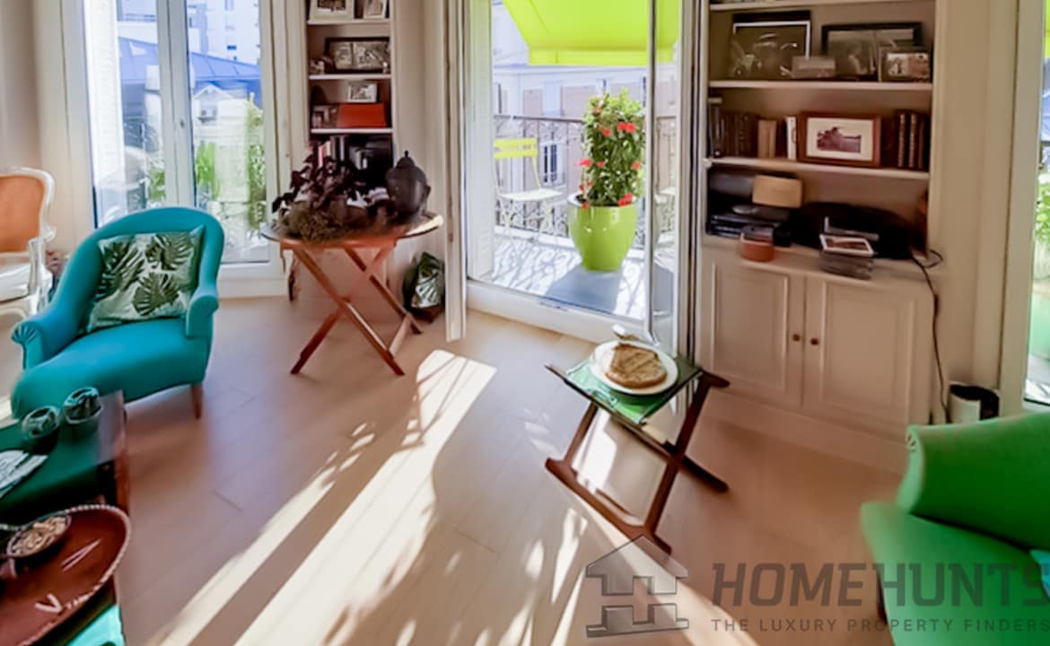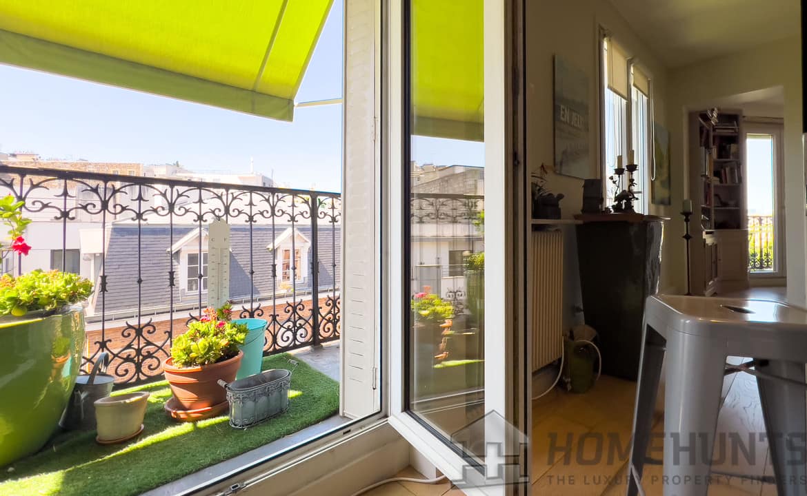 Bathed in light with an unobstructed view of the sky for this 2 bed + studio duplex on the top floors of a very attractive well-maintained and secure Haussmannian building dating from 1890 with lift. A very chic location for this property, with its 7 full-height windows providing exceptional light, a welcoming entrance hall, a bright living room, a very attractive bespoke kitchen opening onto the dining room, a bathroom and separate WC. The upper duplex includes a study, 2 bedrooms, 22m2 studio, 5 balconies (3.52m2) and 2 shower room with laundry area.