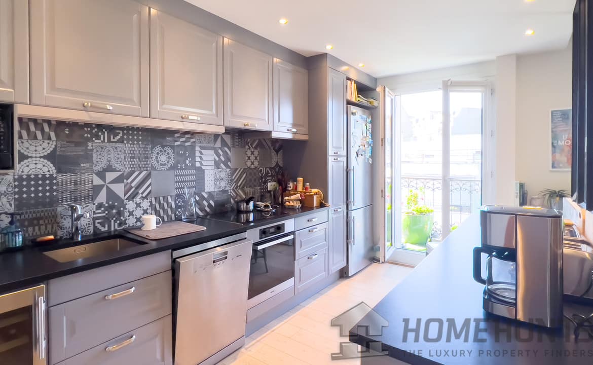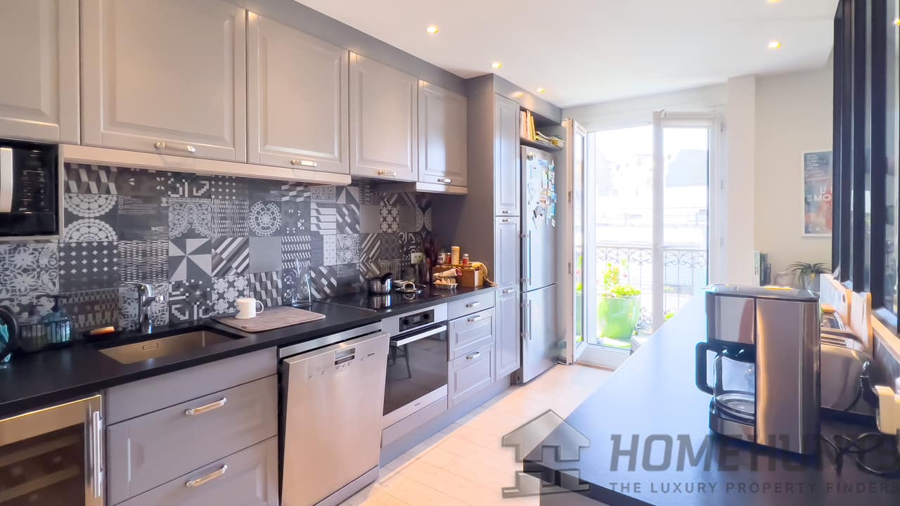 A very chic location for this property, with its 7 full-height windows providing exceptional light, a welcoming entrance hall, a bright 25m2 living room, a very attractive bespoke 11m2 kitchen opening onto the 15m2 dining room, a bathroom and separate WC. The upper duplex includes a study, 2 bedrooms, 2 balconies (1.4m2) and 1 shower room with laundry area.
