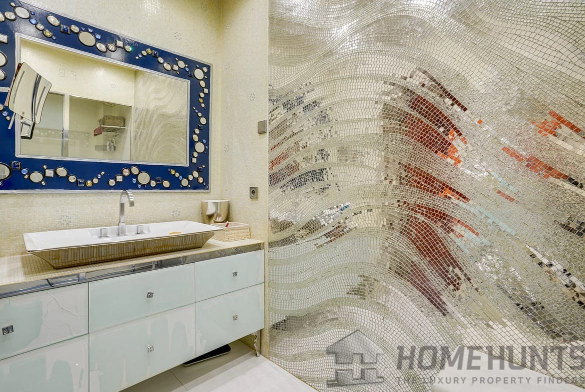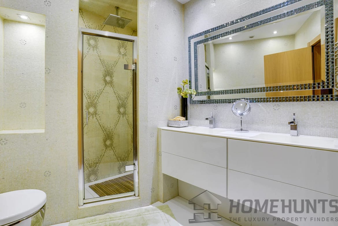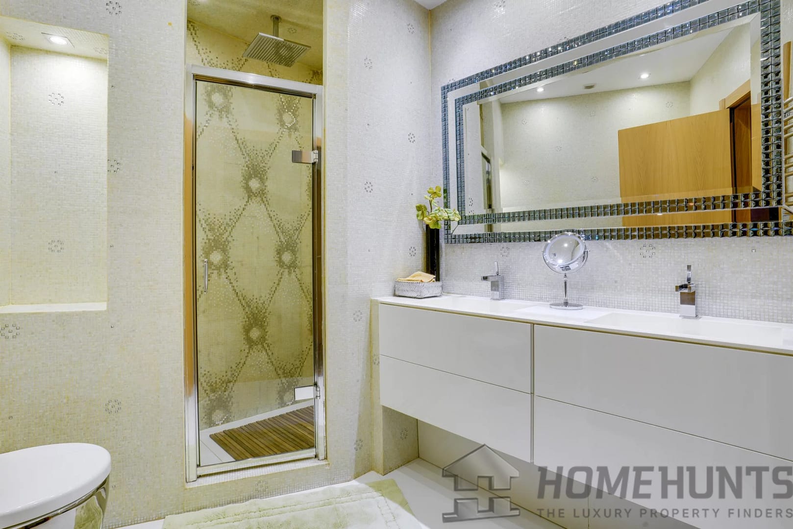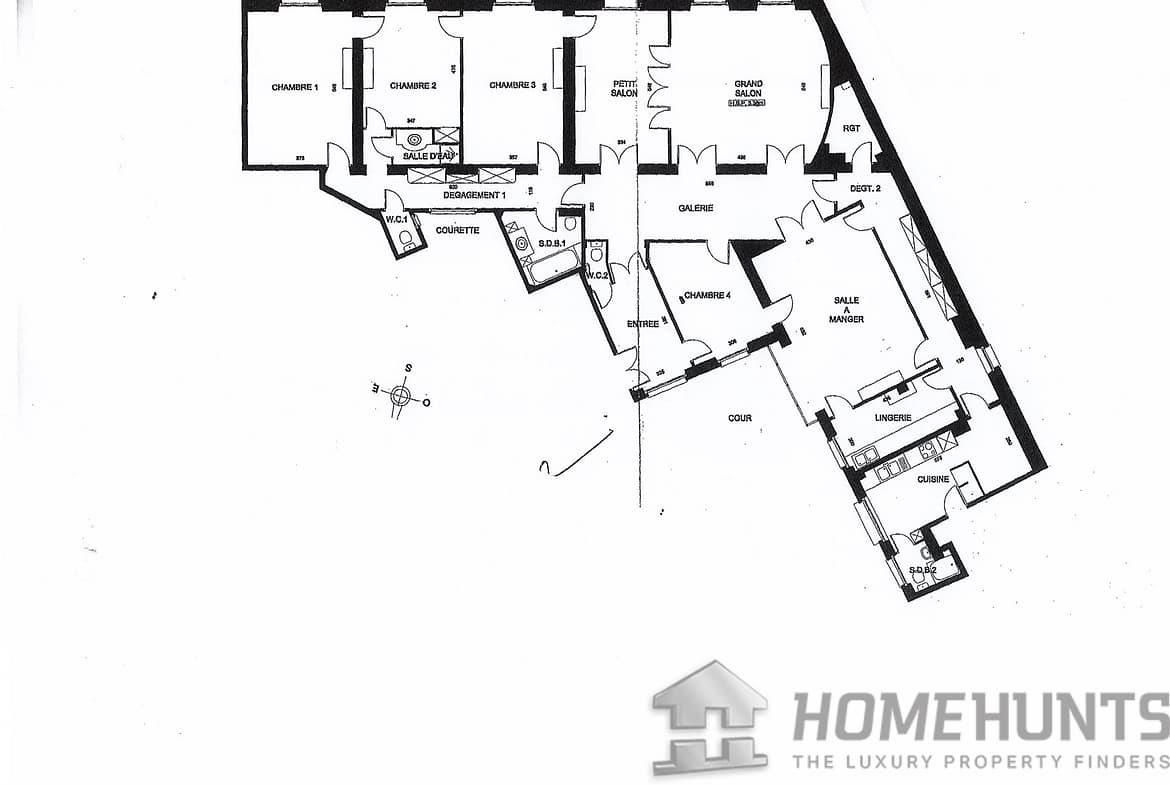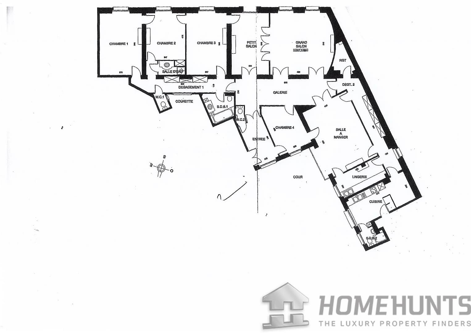 The south-facing apartment is organized as follows: entrance hall, guest toilet, large reception room, dining room with adjoining furnished and equipped kitchen, study, three bedrooms, 3 shower rooms, 2 wc.