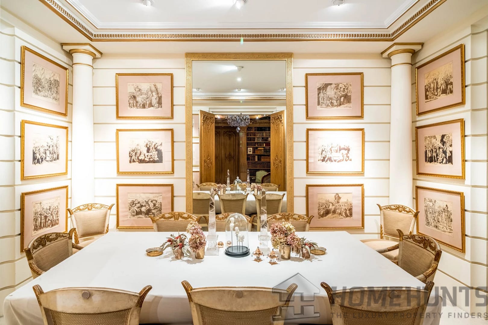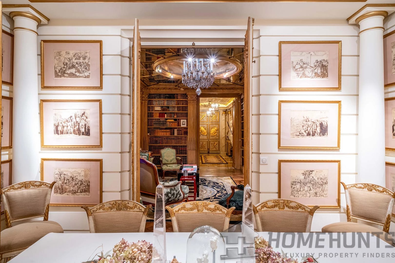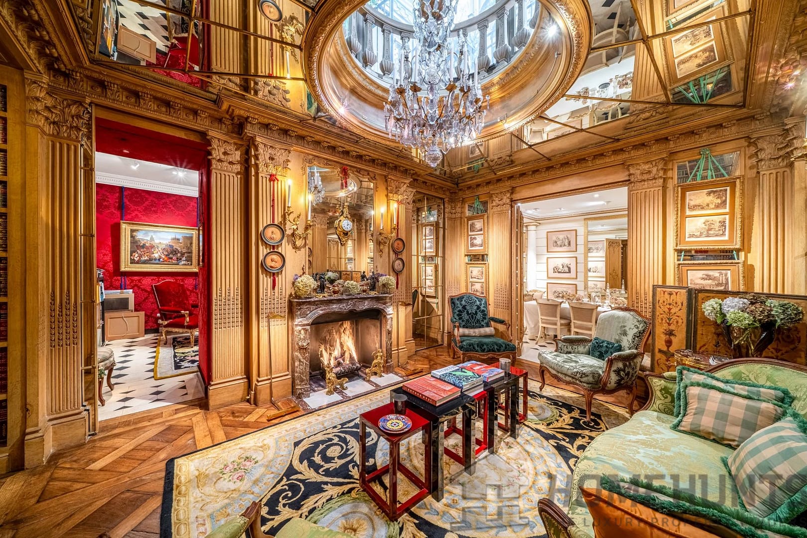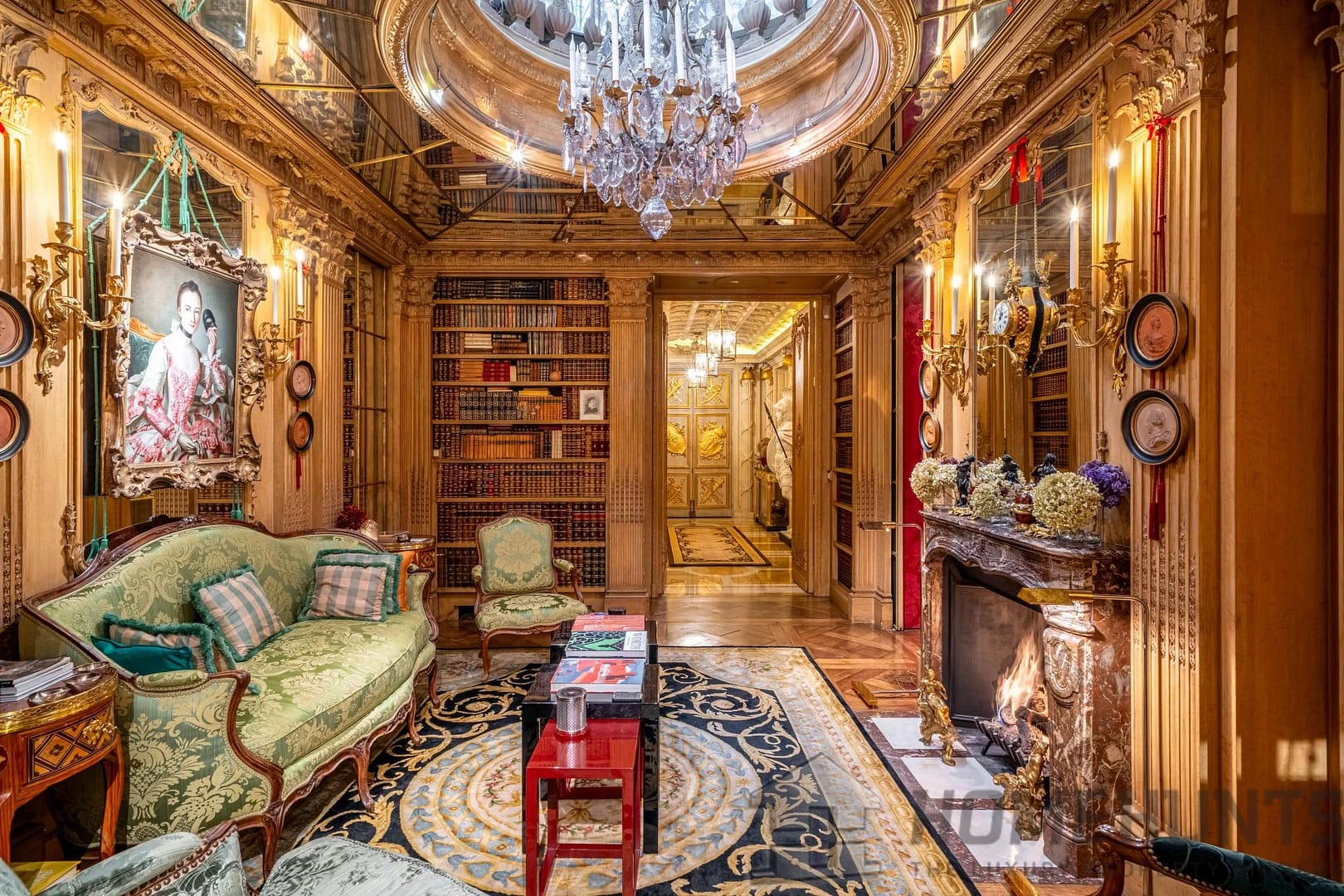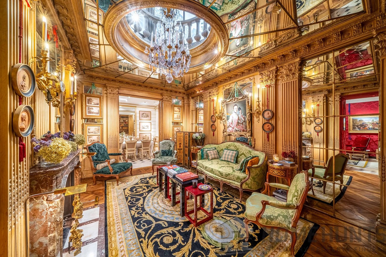 On the first floor, a domed living room, enlivened by a period fireplace and superb woodwork, forms the heart of the house. This is complemented by an elegant study, a reception dining room and a vast library, ideal for entertaining in a setting steeped in history.