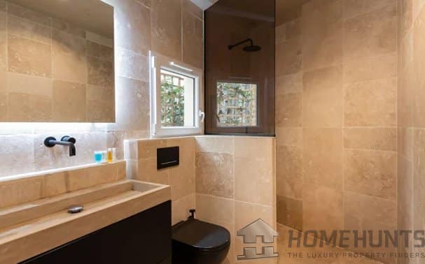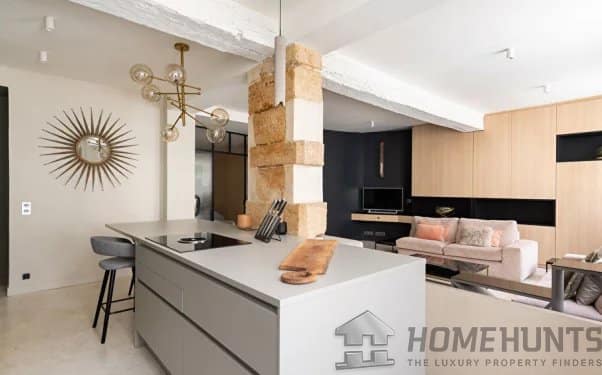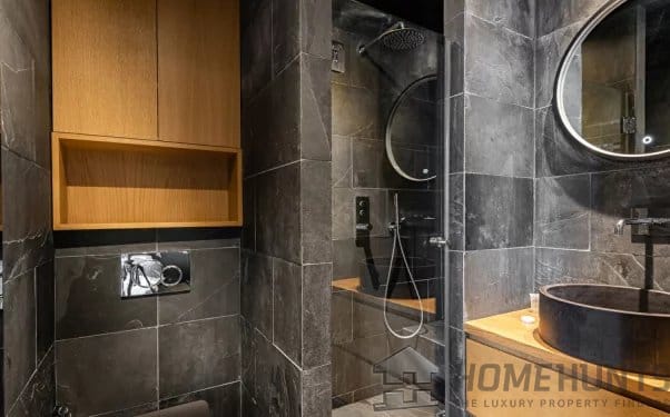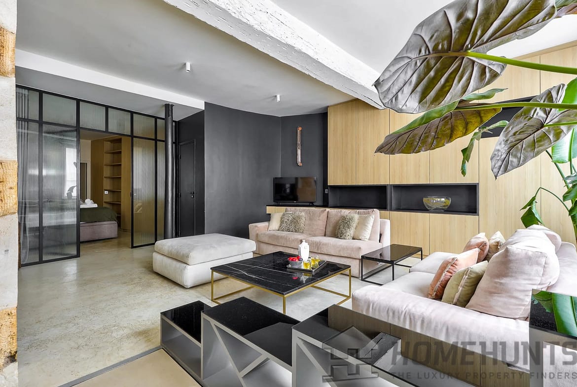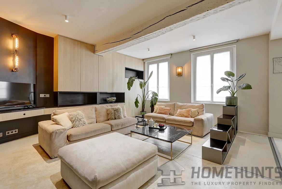 This duplex apartment features an entrance hall, a large, bright living room with a fully equipped open kitchen, a suite with its own shower room and toilet, and, on the lower level (second floor), a second suite with its own shower room and toilet. An office corner is available as an extra. Entirely renovated and furnished with quality materials.