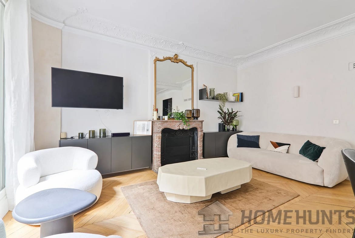 The preservation of original features (Herringbone parquet flooring, fireplaces and moldings) combined with modern furnishings, colors and materials make for a perfect combination, giving the apartment a very special cachet.