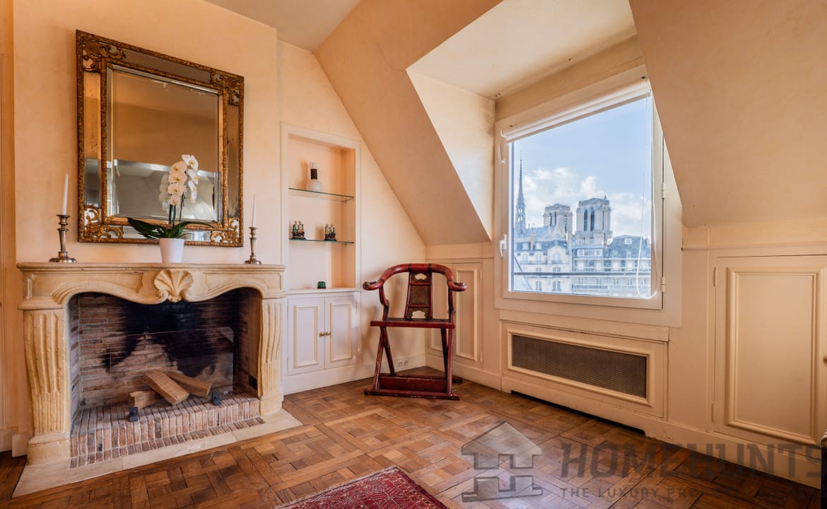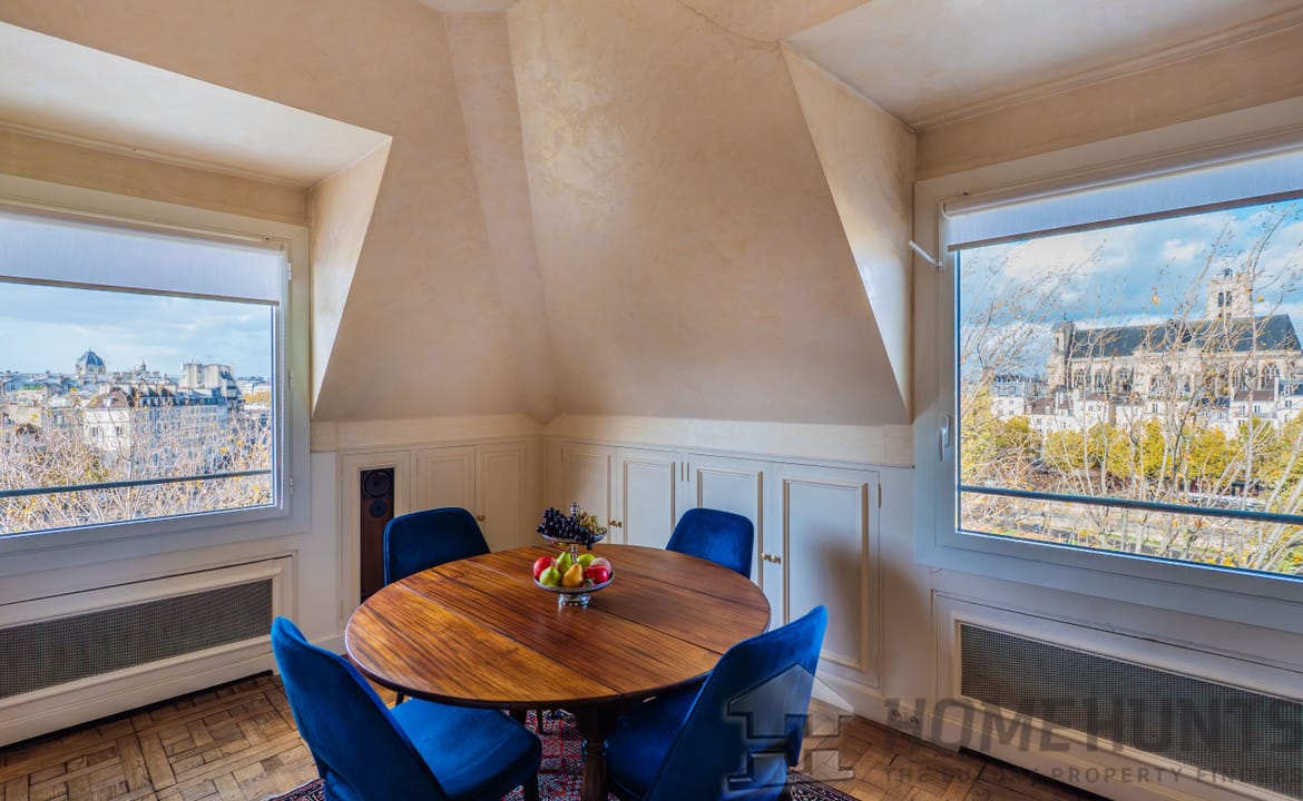 Absolute calm and serenity, triple exposure to the South, West, and North, including 8 windows offering lively and panoramic views of the Seine, the Ile de la Cité, the towers of Notre Dame cathedral, the City Hall, and many historical monuments. A cellar completes this property.