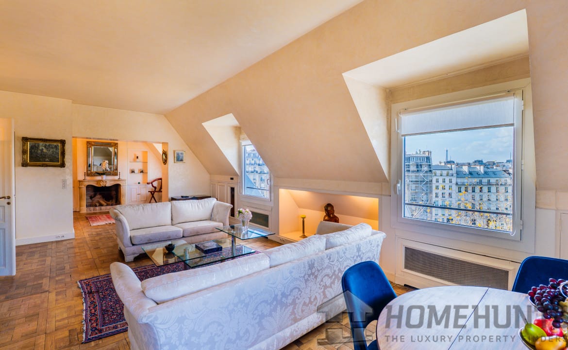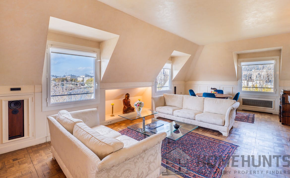 Absolute calm and serenity, triple exposure to the South, West, and North, including 8 windows offering lively and panoramic views of the Seine, the Ile de la Cité, the towers of Notre Dame cathedral, the City Hall, and many historical monuments. A cellar completes this property.