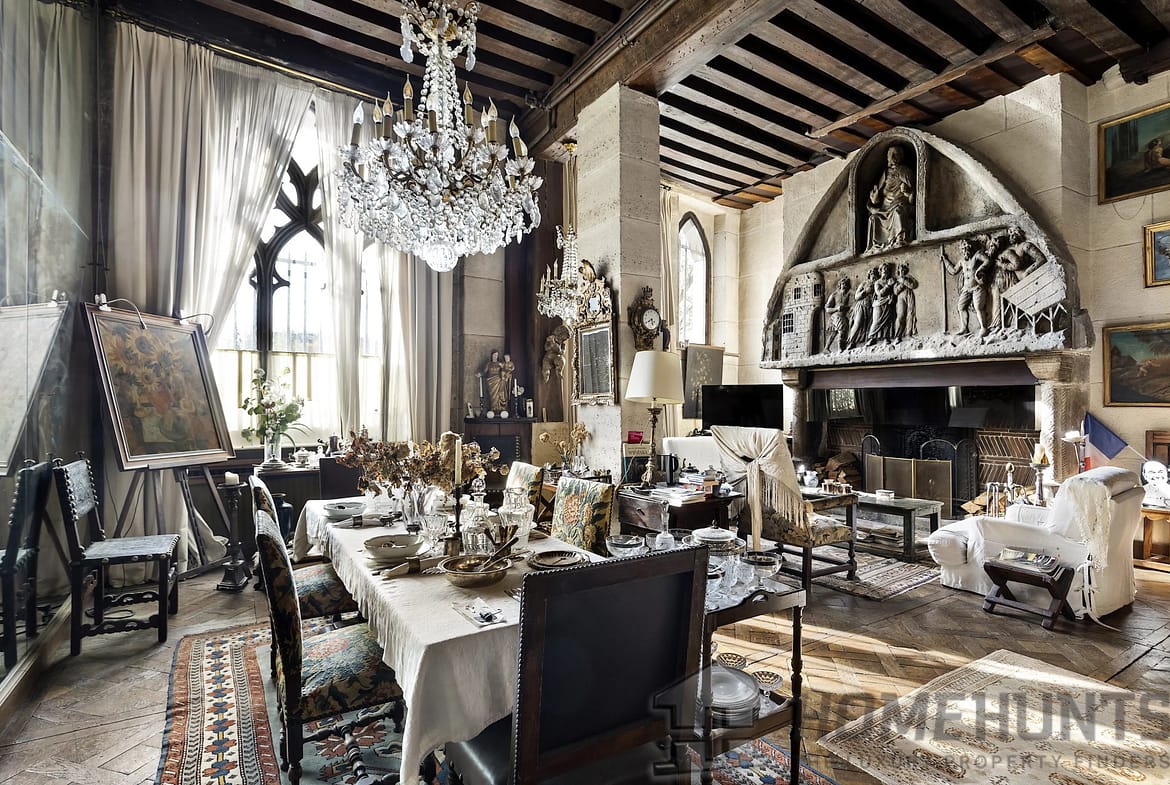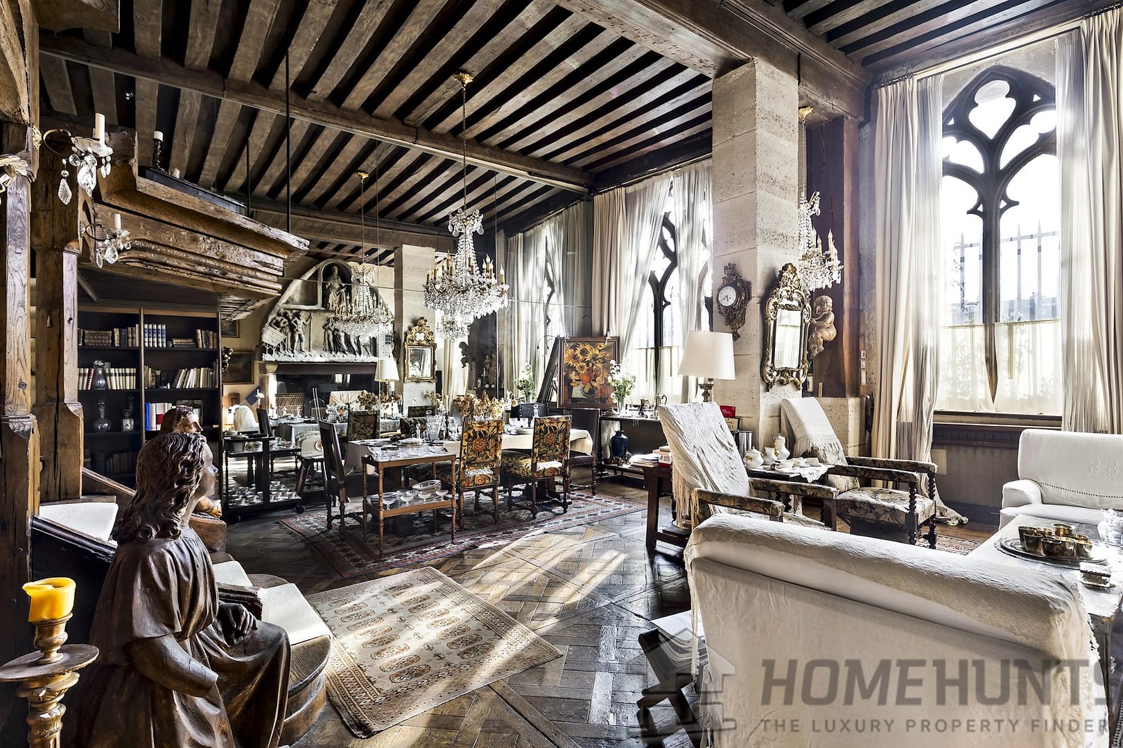 It includes a magnificent living/reception room featuring near 5-metre high ceilings and a monumental fireplace, a kitchen, a study, a guest wc, and two mezzanine bedrooms each with a bath or shower room and dressing room.