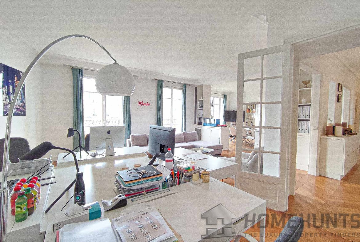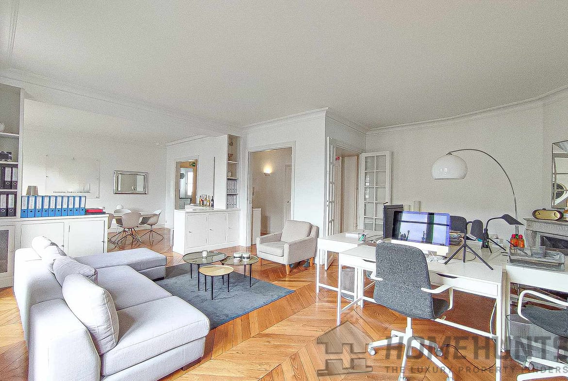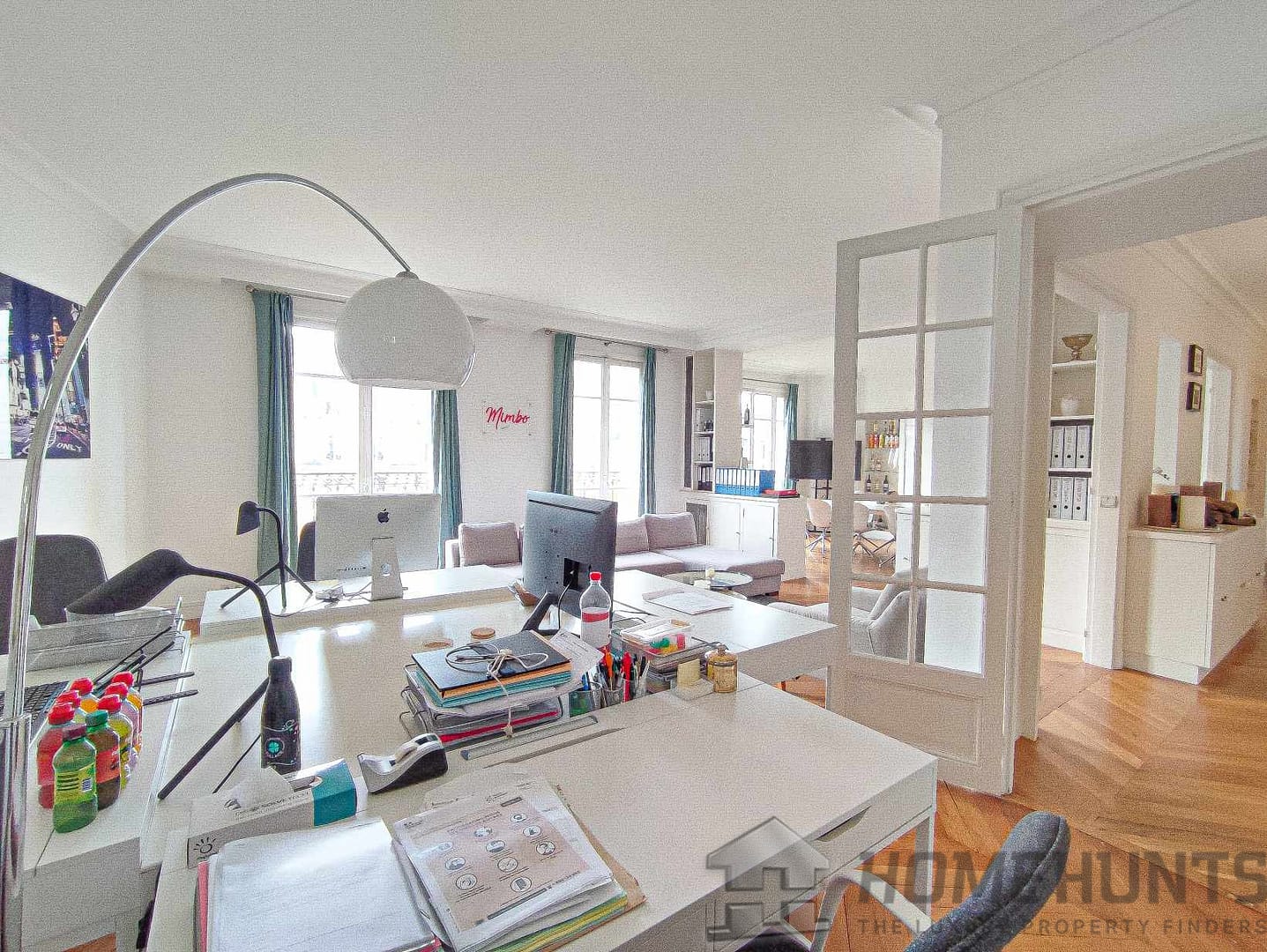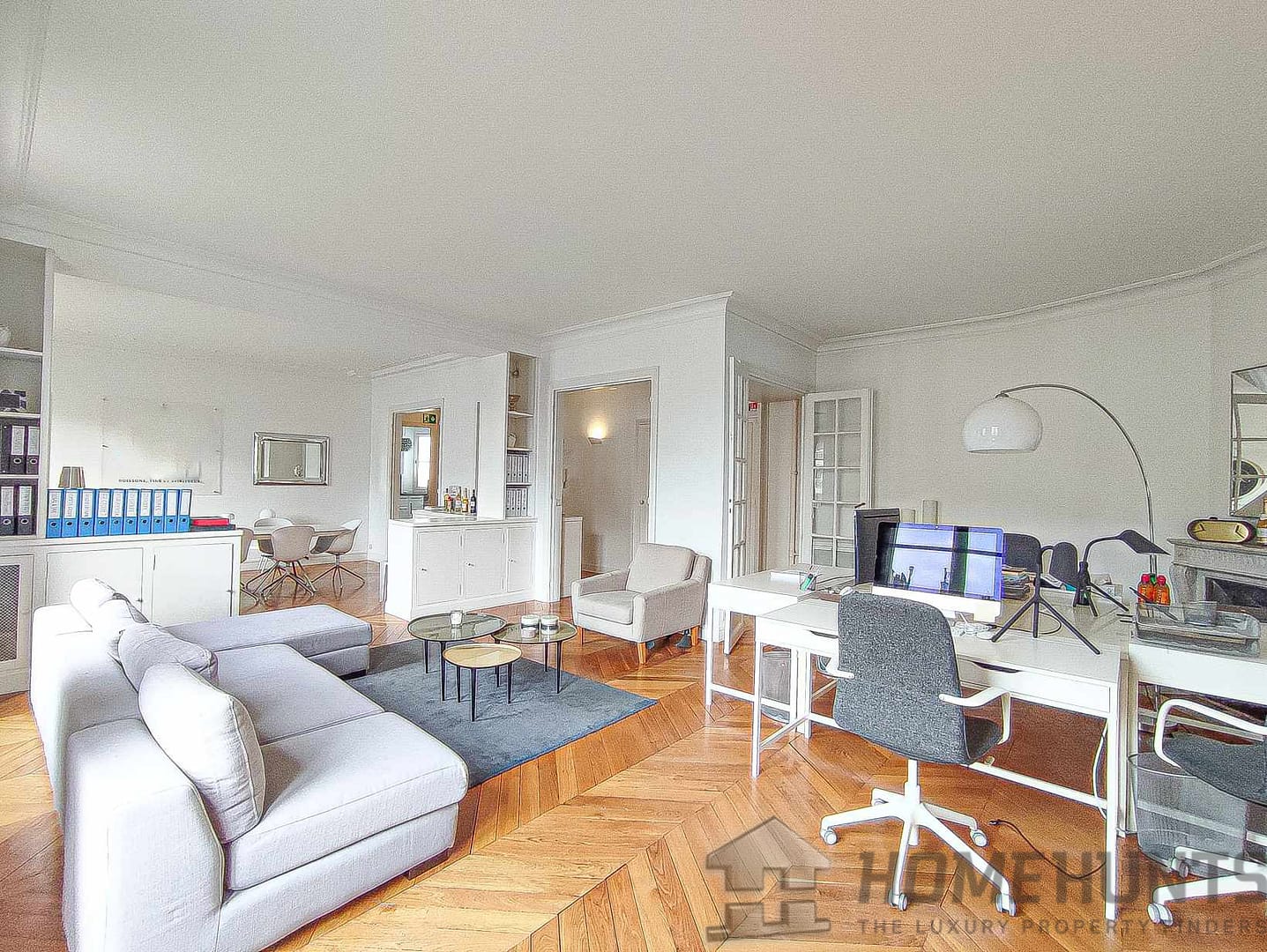 On the 5th floor of a beautiful 1900 freestone building with janitor, we offer this beautiful 153 m2 family apartment. Now used as an office, it comprises a large entrance hall, a living room and a dining room forming a 60 m2 double reception room, all facing southwest and opening onto a balcony with an Eiffel Tower view. The suite includes a separate, fully-equipped kitchen, 3 bedrooms (14, 15 and 18 m2 respectively), a bathroom, a shower room, 2 toilets, a laundry room and a storage room (which could also be used as a nursery or office).