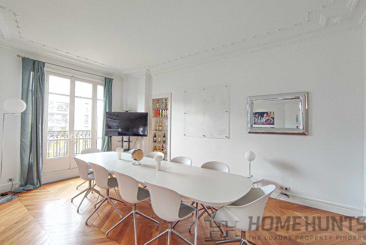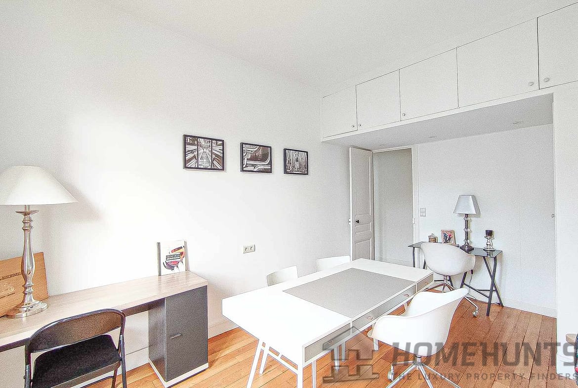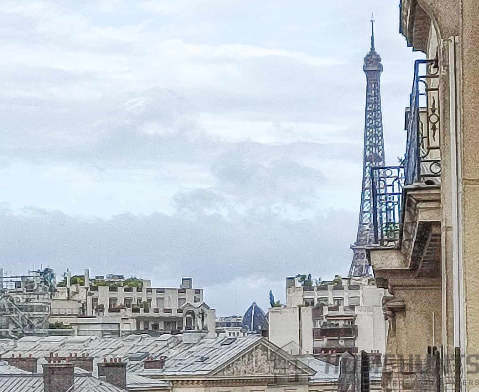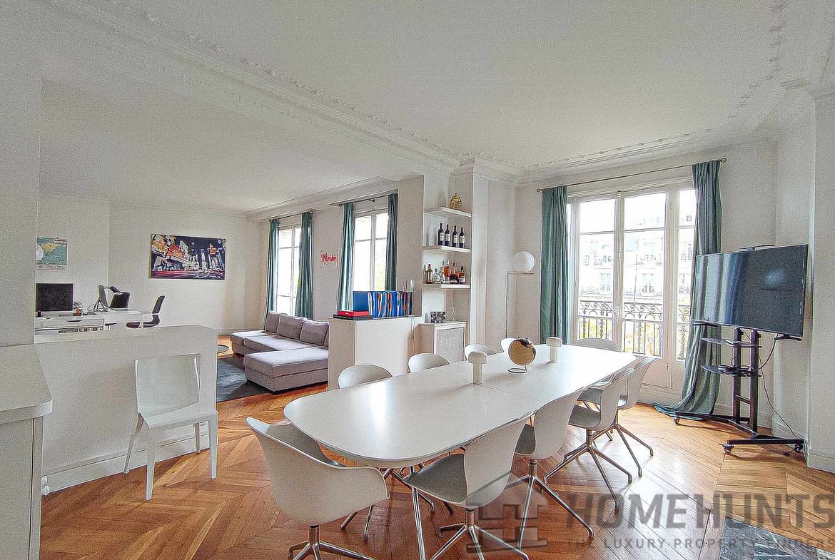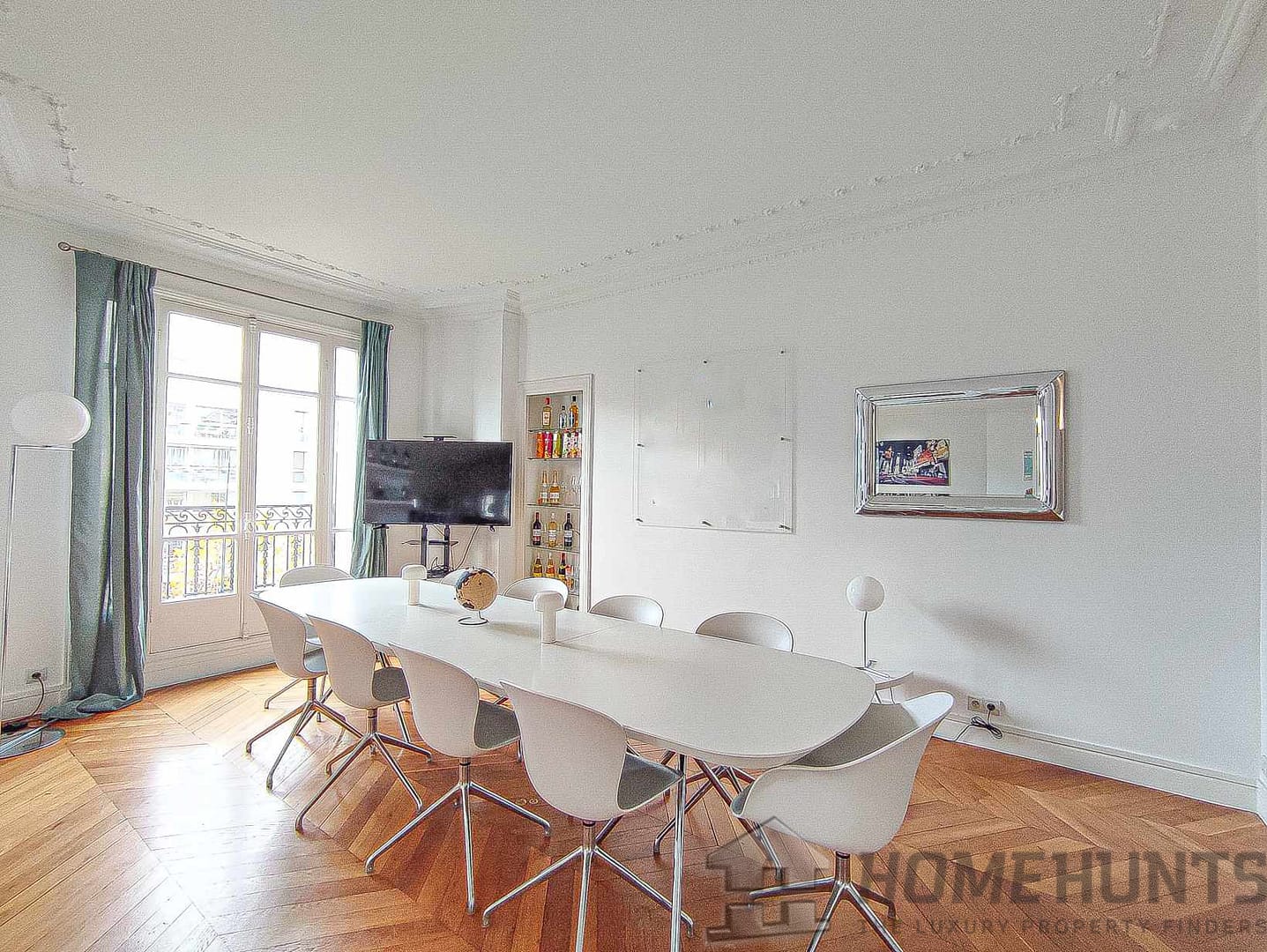 On the 5th floor of a beautiful 1900 freestone building with janitor, we offer this beautiful 153 m2 family apartment. Now used as an office, it comprises a large entrance hall, a living room and a dining room forming a 60 m2 double reception room, all facing southwest and opening onto a balcony with an Eiffel Tower view. The suite includes a separate, fully-equipped kitchen, 3 bedrooms (14, 15 and 18 m2 respectively), a bathroom, a shower room, 2 toilets, a laundry room and a storage room (which could also be used as a nursery or office).