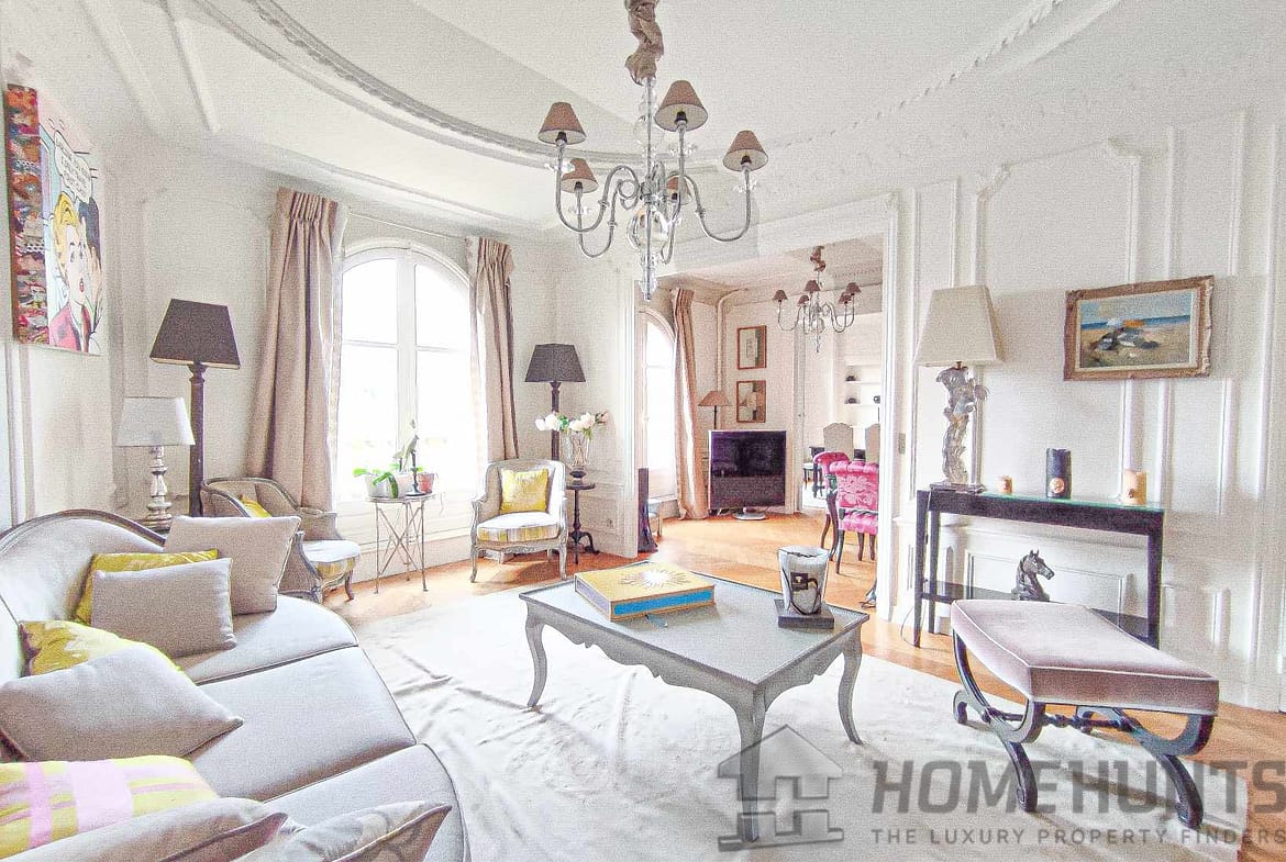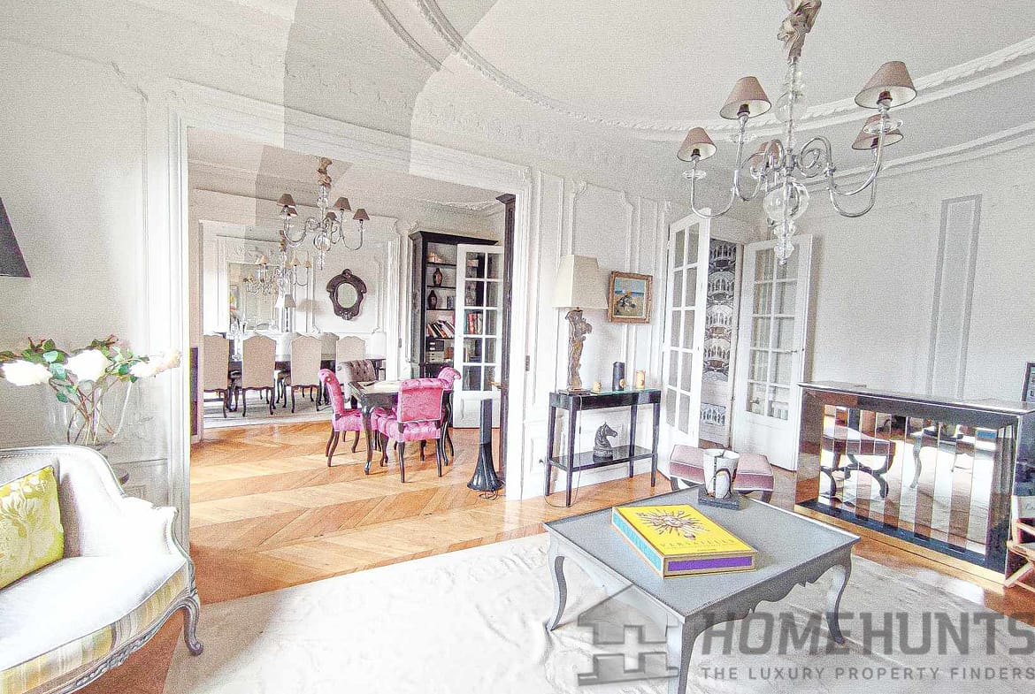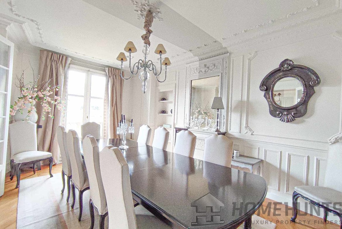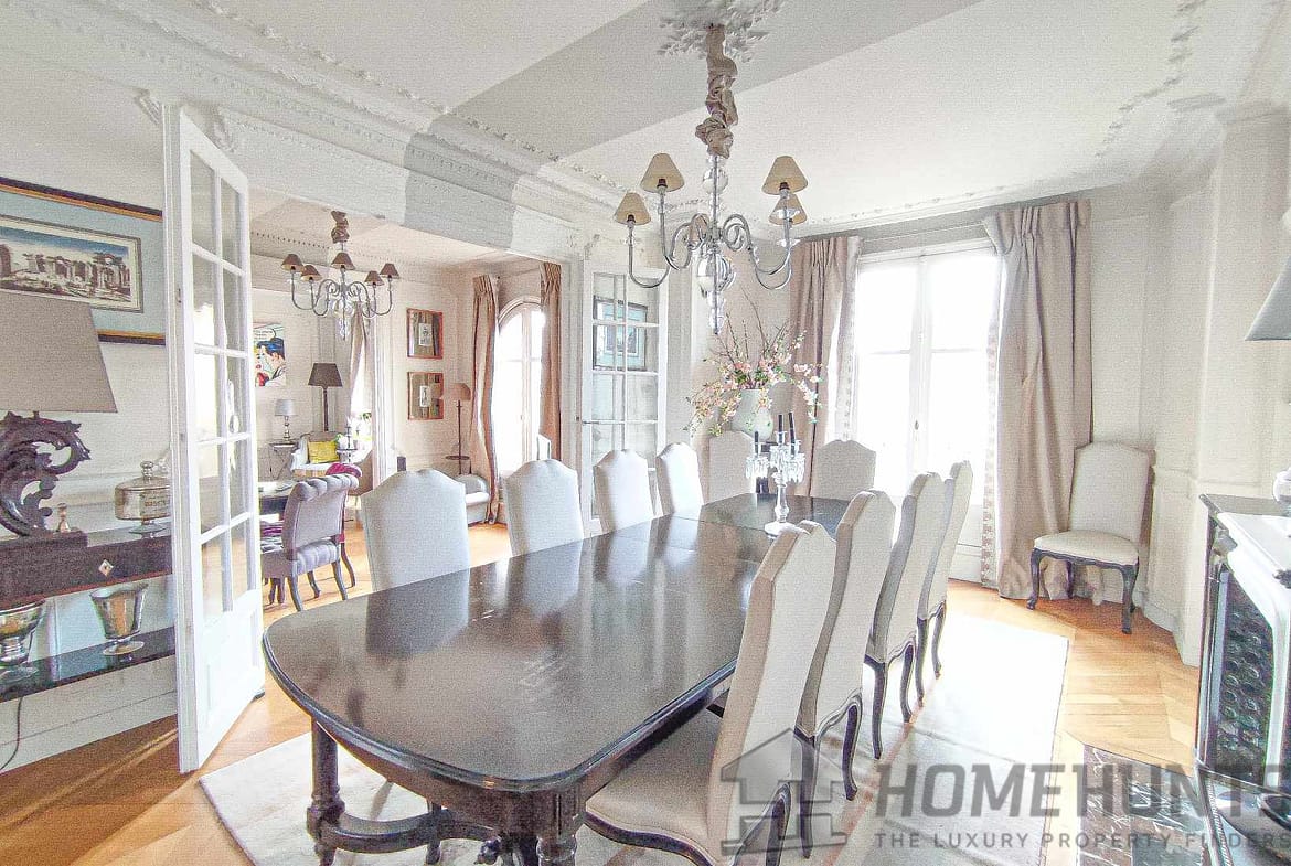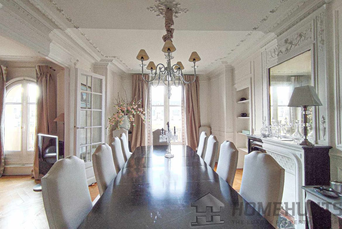 The apartment consists of an entrance gallery, a double living room, a dining room forming a triple reception room of 60 m2 with period parquet flooring, cornice/mouldings and beautiful fireplaces, a separate and equipped kitchen.