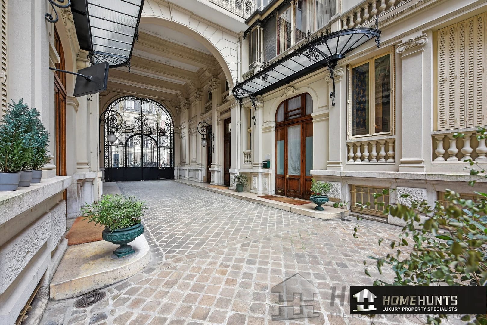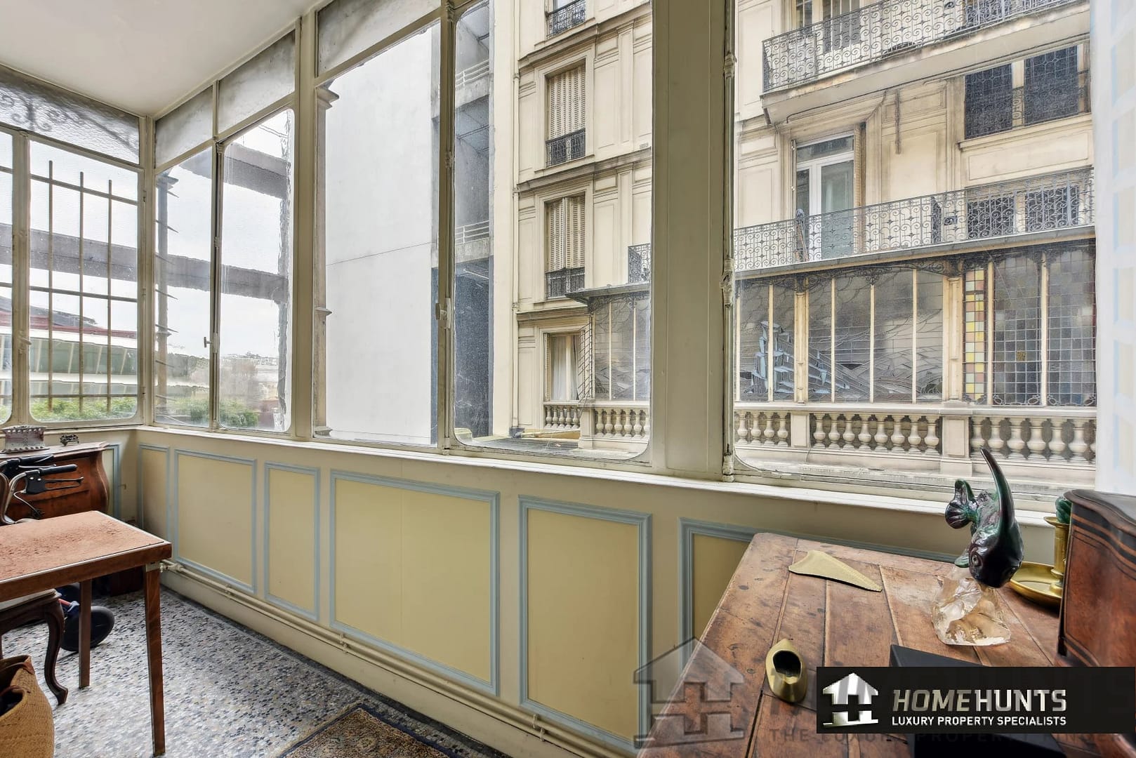 Accommodation, double living room with authentic parquet floors, mouldings and 4 large windows facing south west; spacious entrance gallery leading to 2 large bedrooms, one has its own bathroom and toilet, and another shower room with separate toilet. A winter garden extends the master suite onto the quiet courtyard. Numerous storage cupboards.