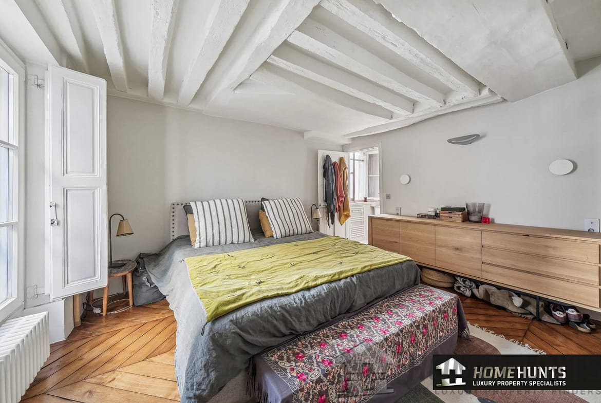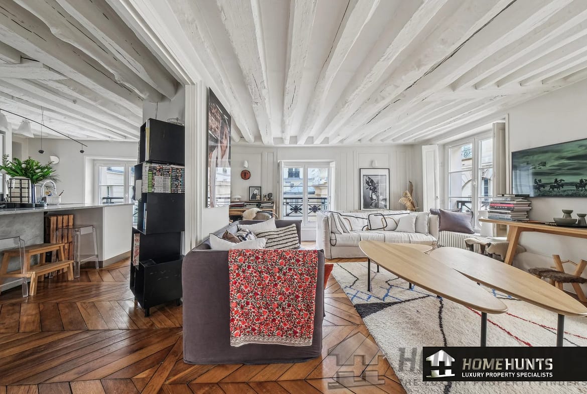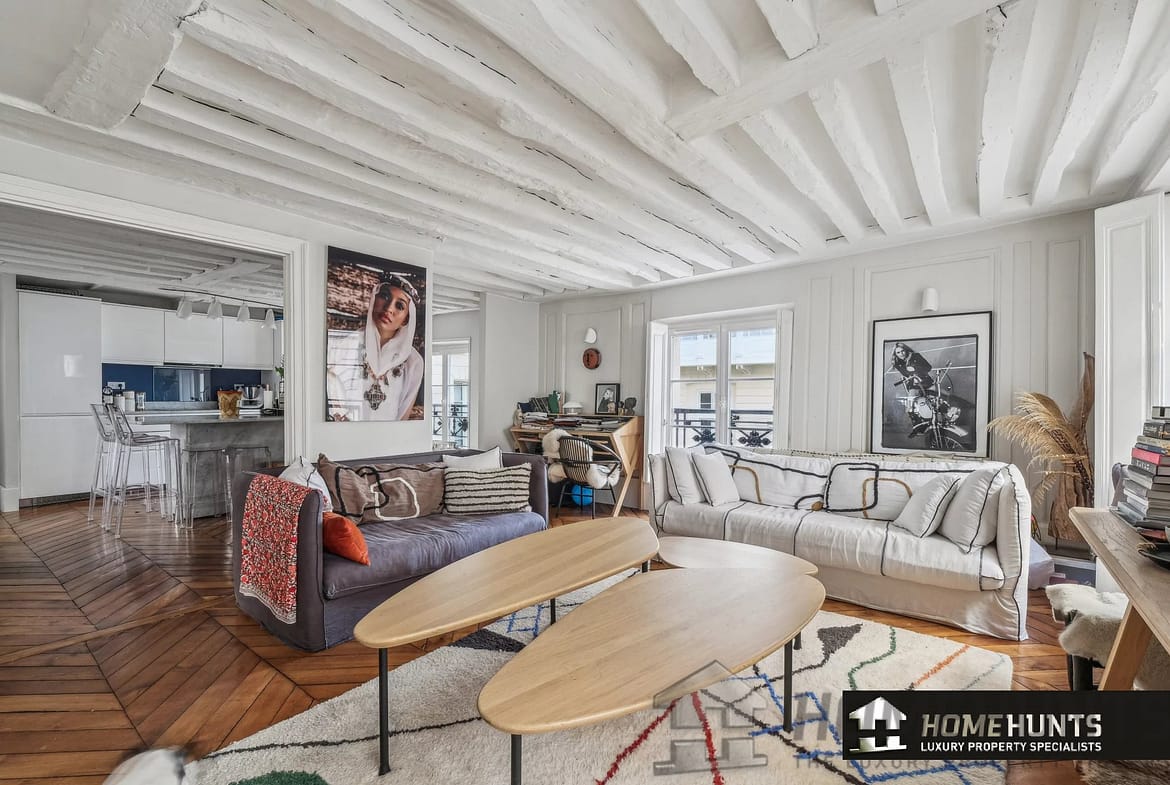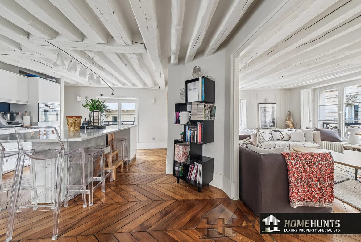 All the old features have been preserved: parquet flooring, exposed beams, moldings and functional fireplace.