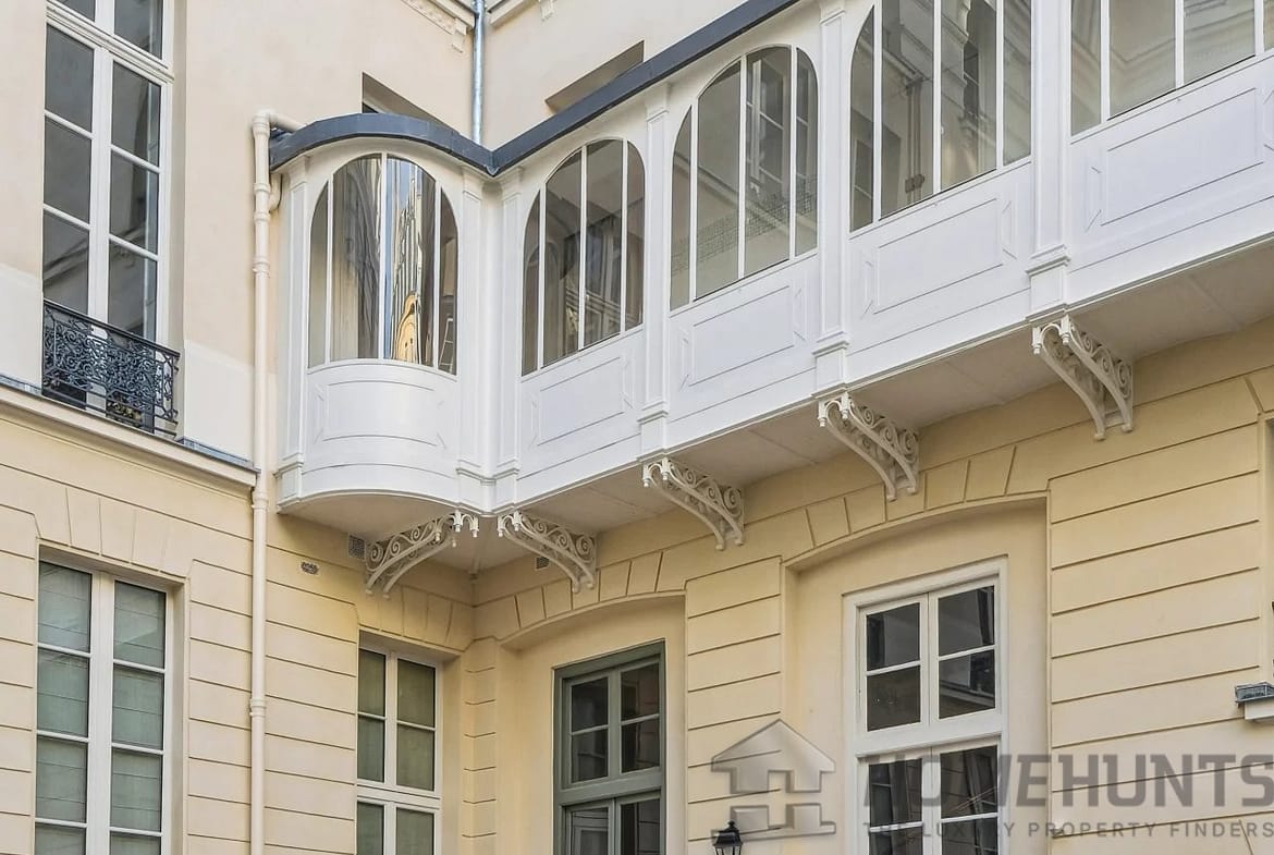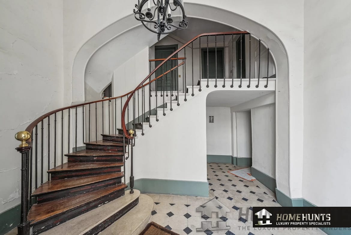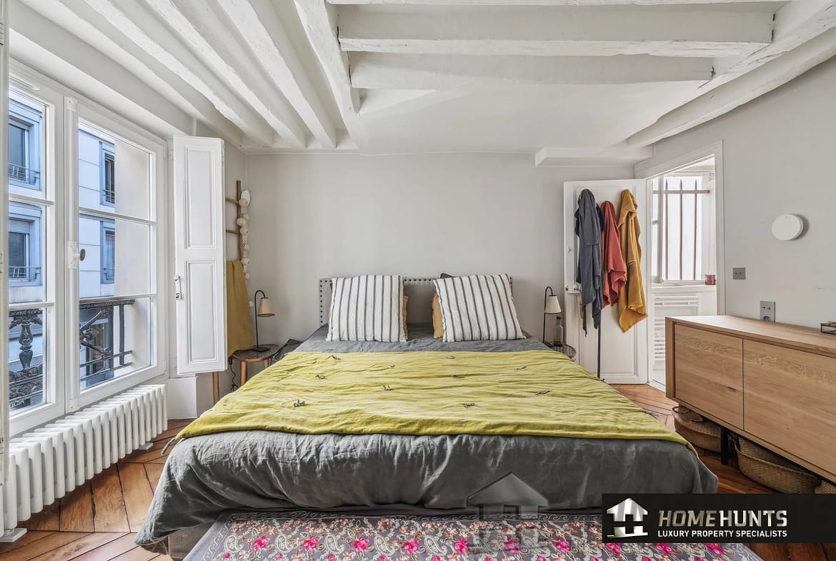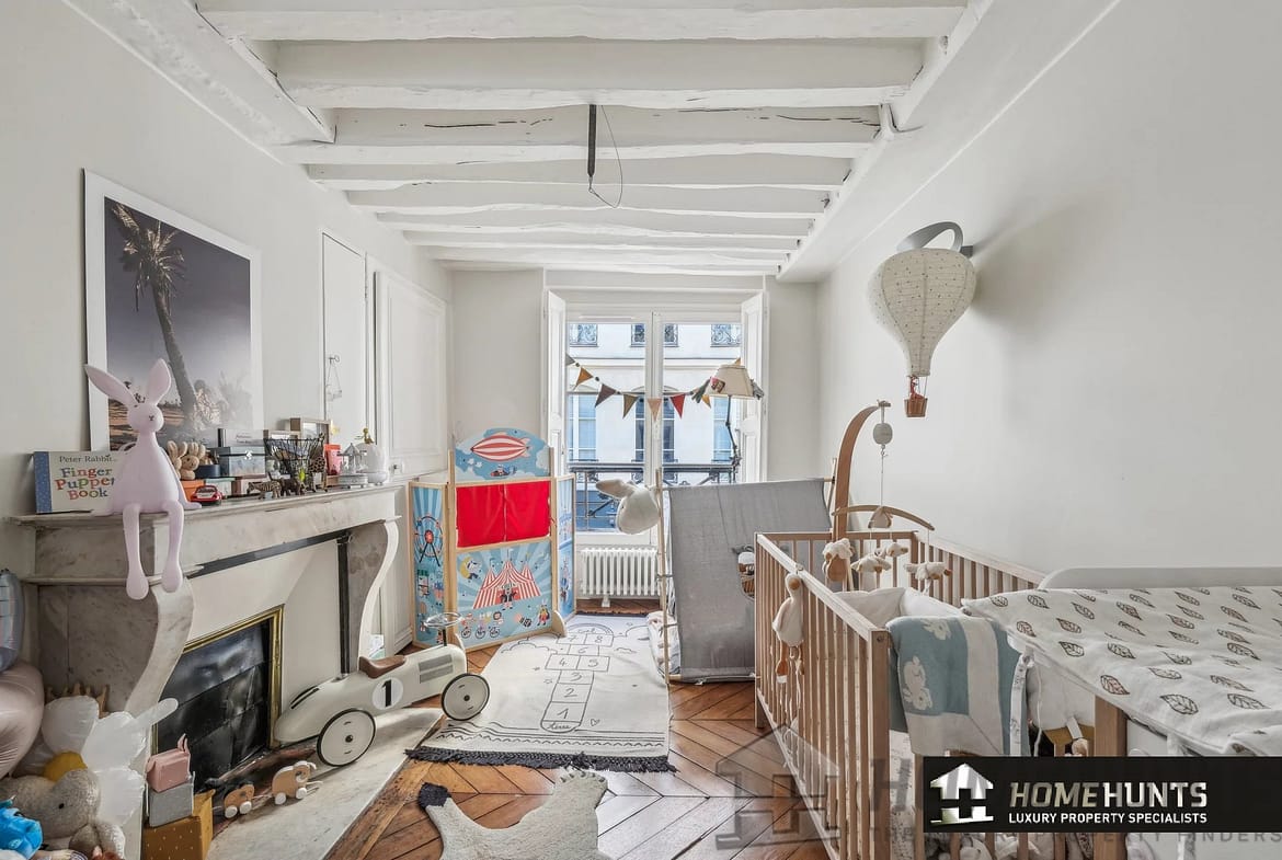 All the old features have been preserved: parquet flooring, exposed beams, moldings and functional fireplace.