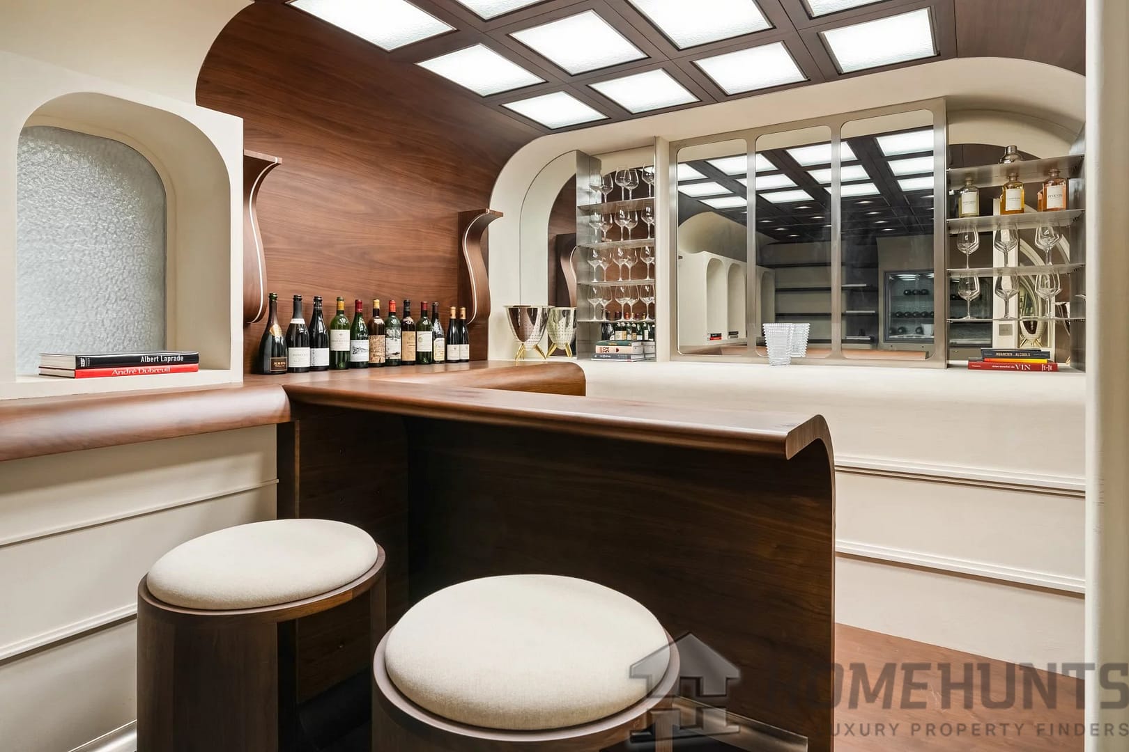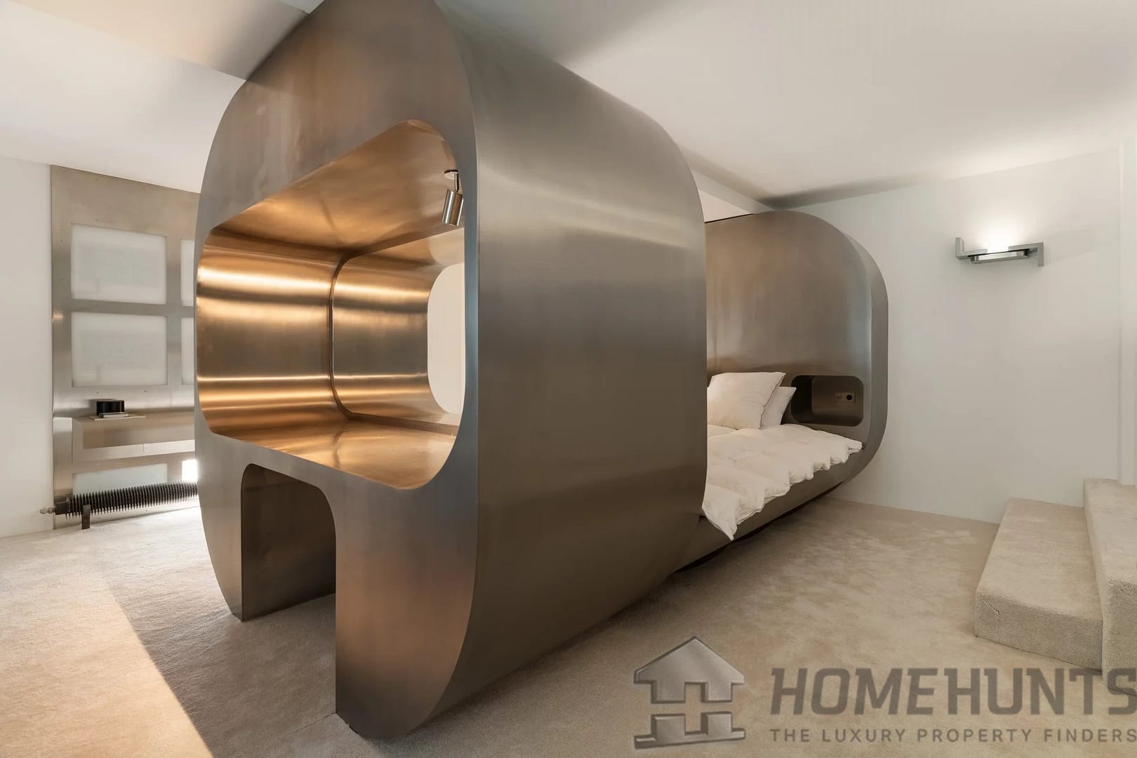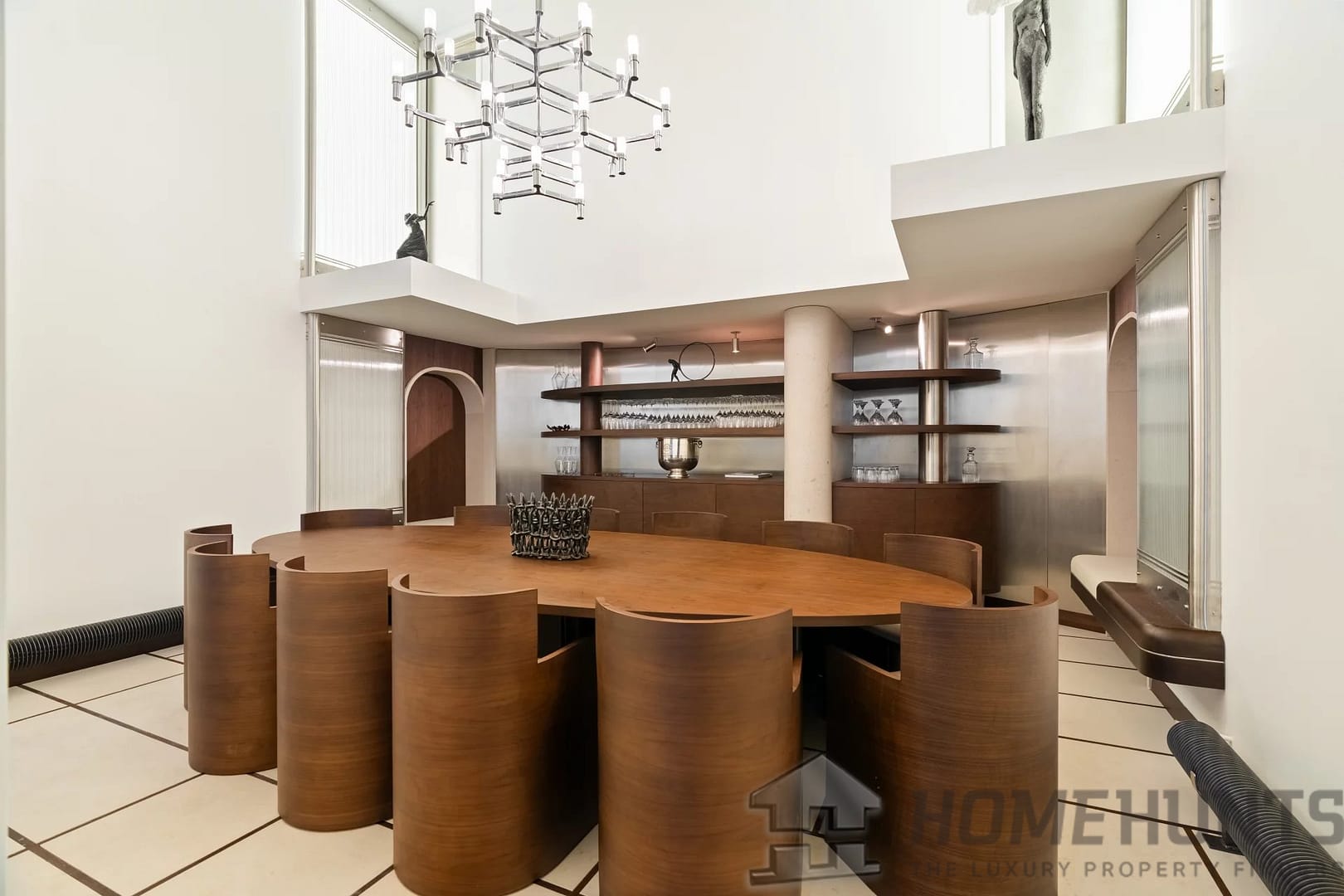 The result is spectacular: a suspended, almost unreal atmosphere where every detail counts. Two bedrooms, including a magnificent suite, a huge dining room, a professional kitchen, a bar, a wine cellar, a yoga room, a sauna, a hammam… All fully furnished and decorated with bespoke pieces, in a subtle balance between wood and steel, soft curves and bold lines.