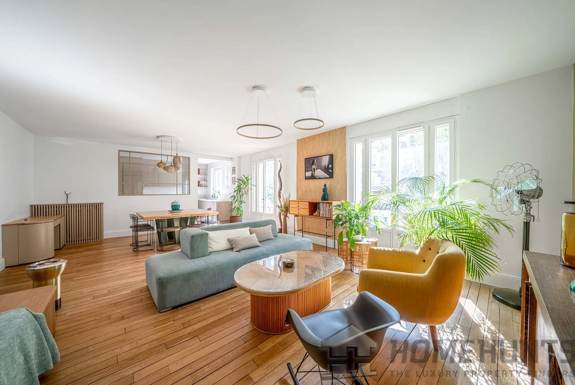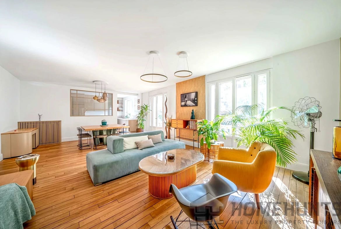 Living space comprising an entrance hall with dressing room and plenty of bespoke storage space, a large double living room (42 m2) bathed in light (south-facing) overlooking a charming private tree-lined cul-de-sac lined with mansions, a semi-open kitchen fully fitted and equipped with high-quality materials, and a guest WC. On the night side, there is a bedroom (19m2) in a quiet location overlooking the garden with plenty of custom storage space, a bathroom with double sinks and a toilet, and a master suite (18m2) with a walk-in shower.