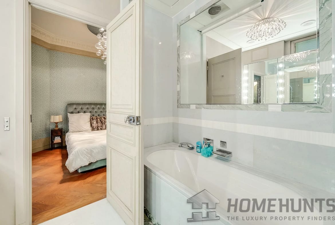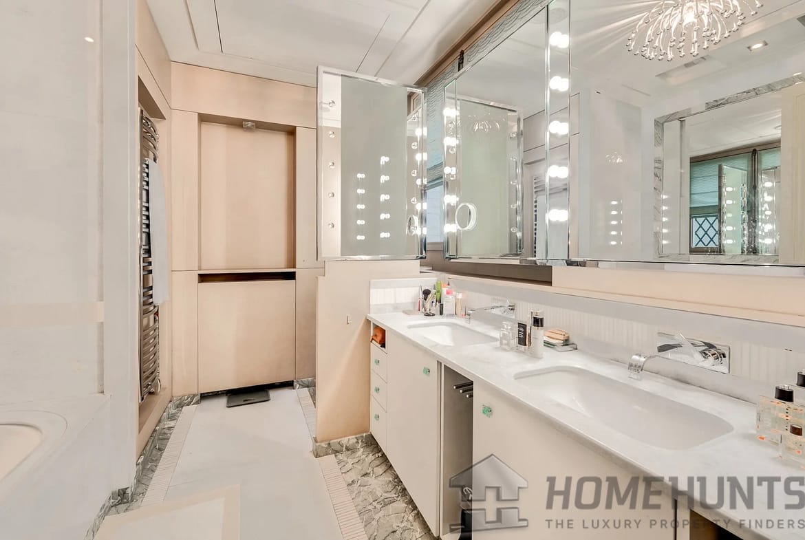 The living spaces, elegant and opulent offer a stunning large double living room, adjoining dining room and separate kitchen. A dressing room and guest toilet make up the entrance gallery. A suite with dressing room and bathroom.