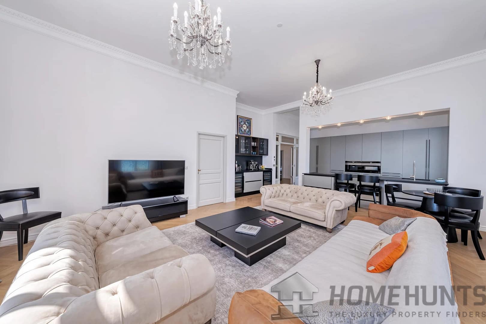 With a surface area of 160 m2, it comprises an entrance hall, a dining room, a fully-equipped open kitchen, 3 en suite bedrooms with built-in closets and three south-facing balconies.