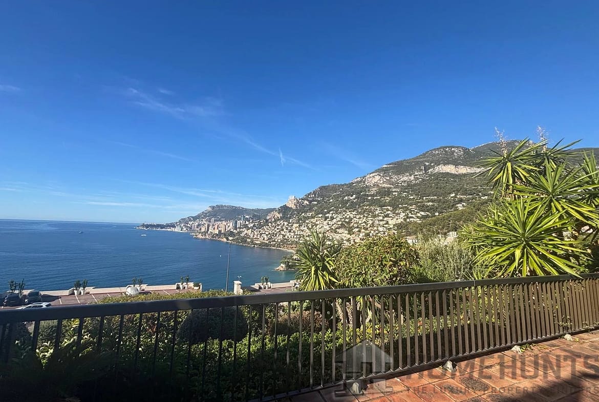 Located in a secure residence with a swimming pool, this 2 bedroom sea view apartment features a garden and terrace with panoramic views of the sea and Monaco.