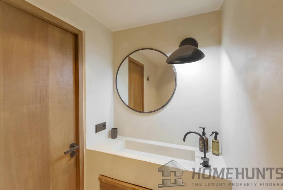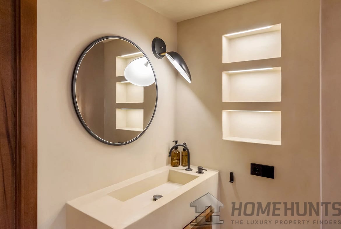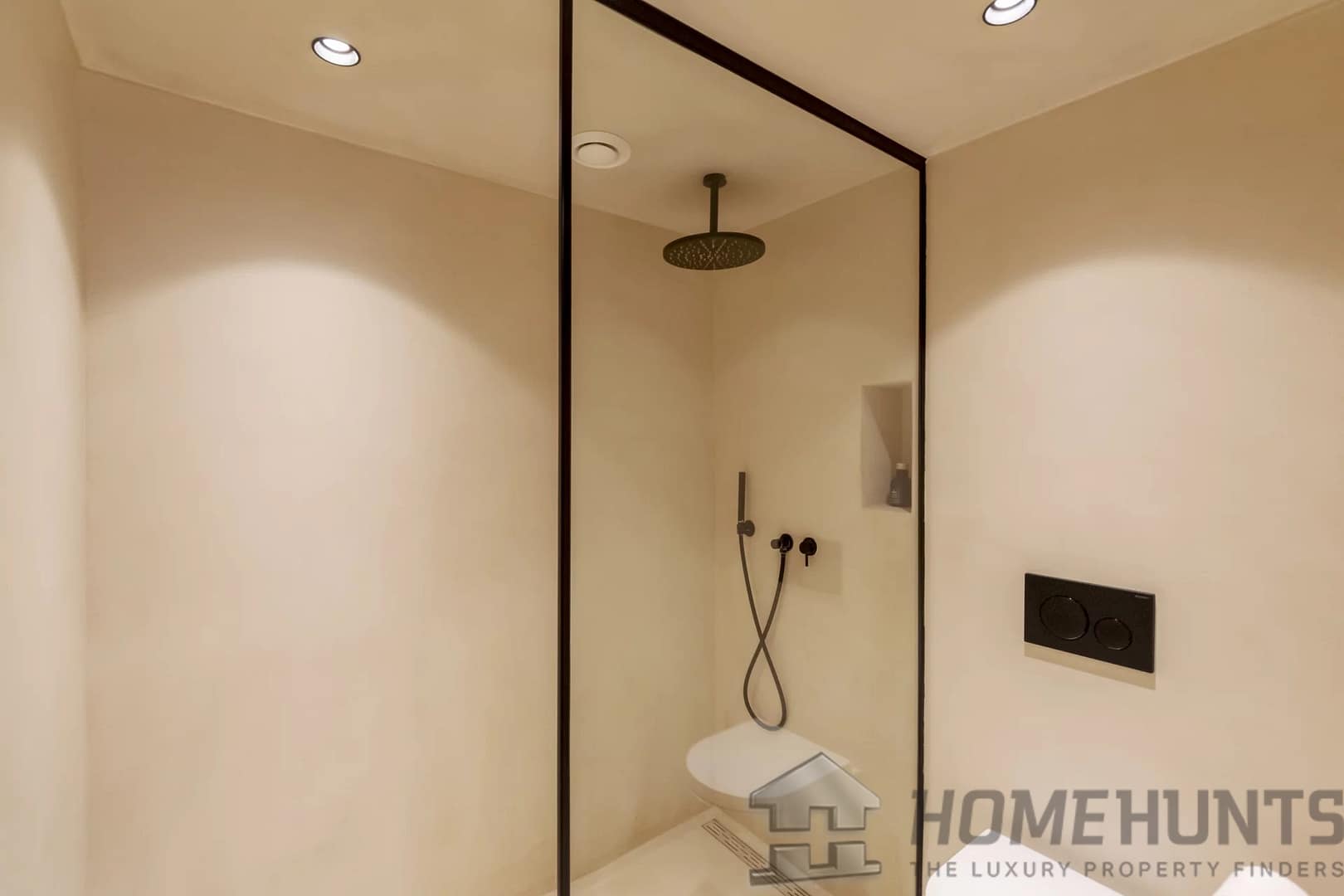The interior design is contemporary and sophisticated, featuring microcement floors, underfloor heating, and floor-to-ceiling windows that flood the space with natural light.