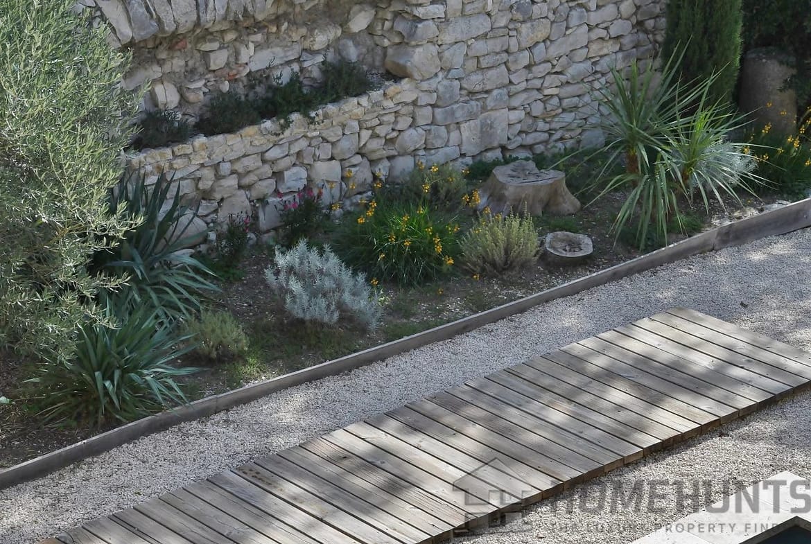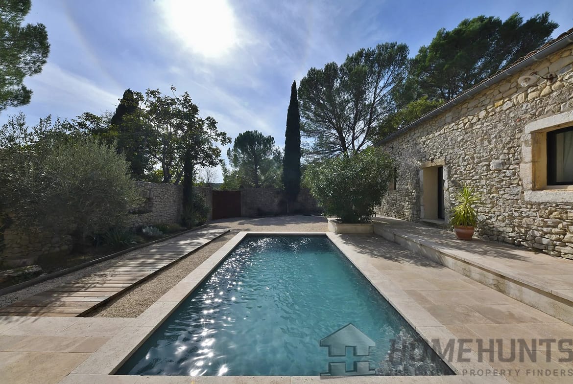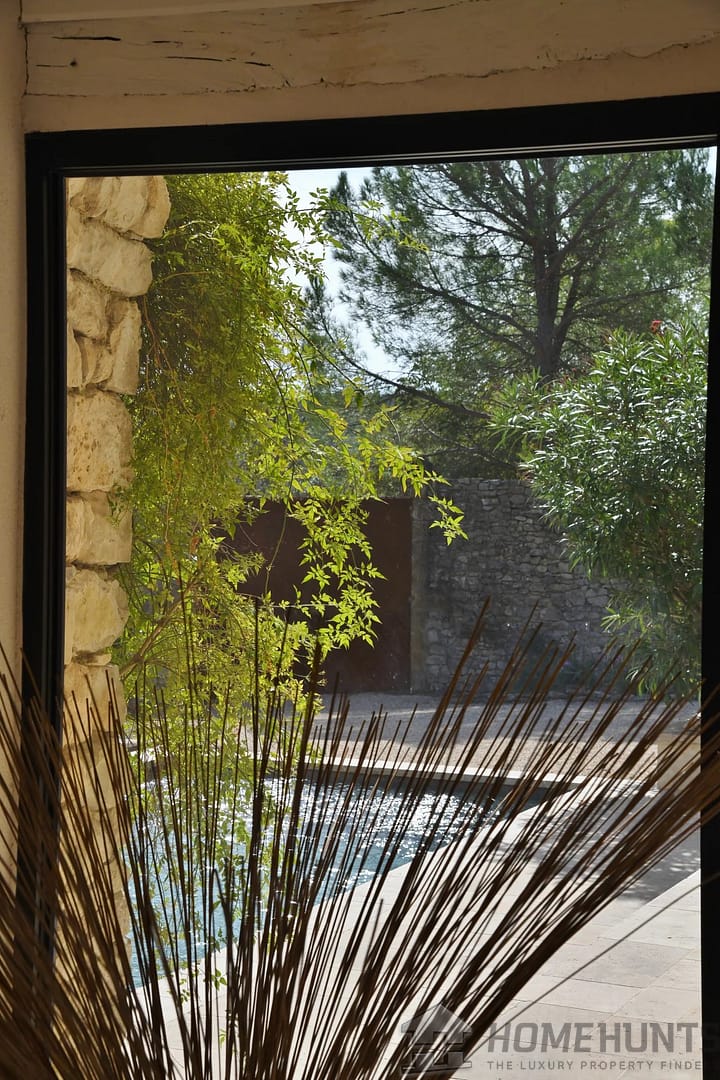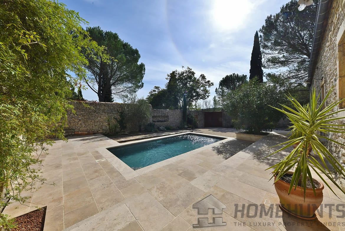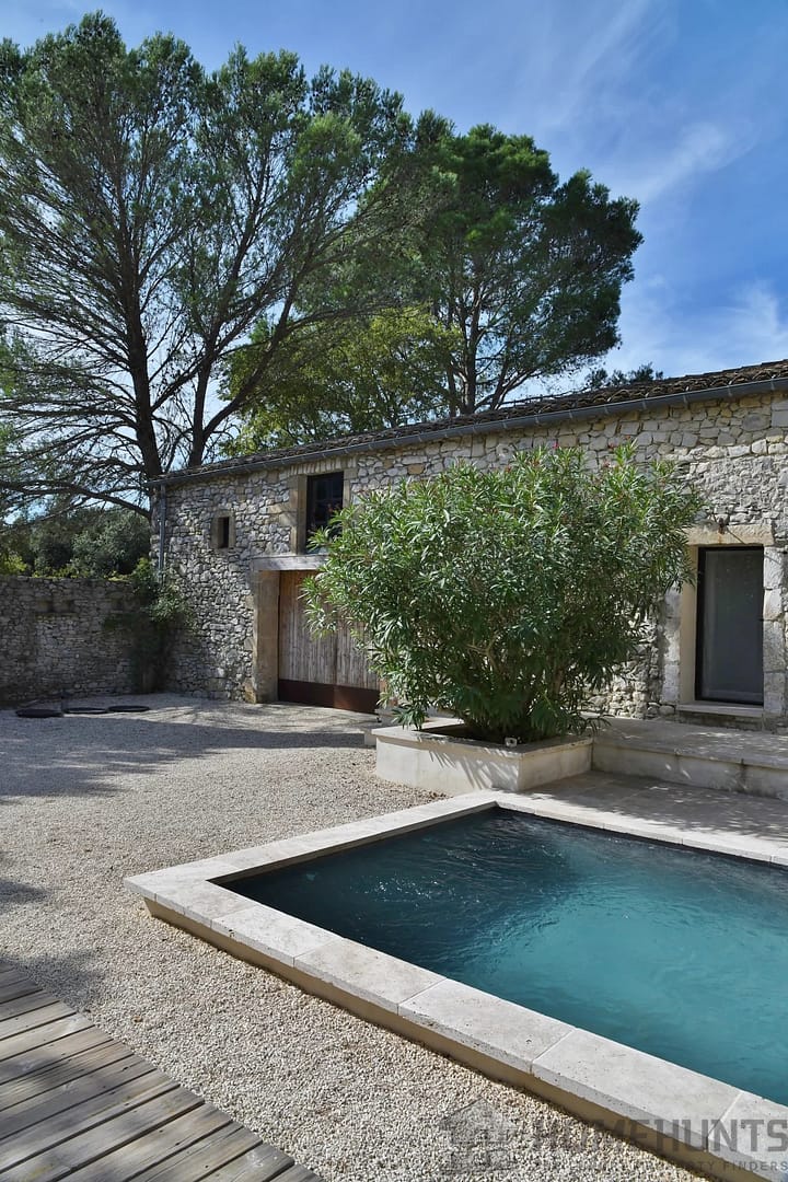 The enclosed garden with trees and a 6 x 3 metre swimming pool offers an intimate and pleasant outdoor space, ideal for relaxation.