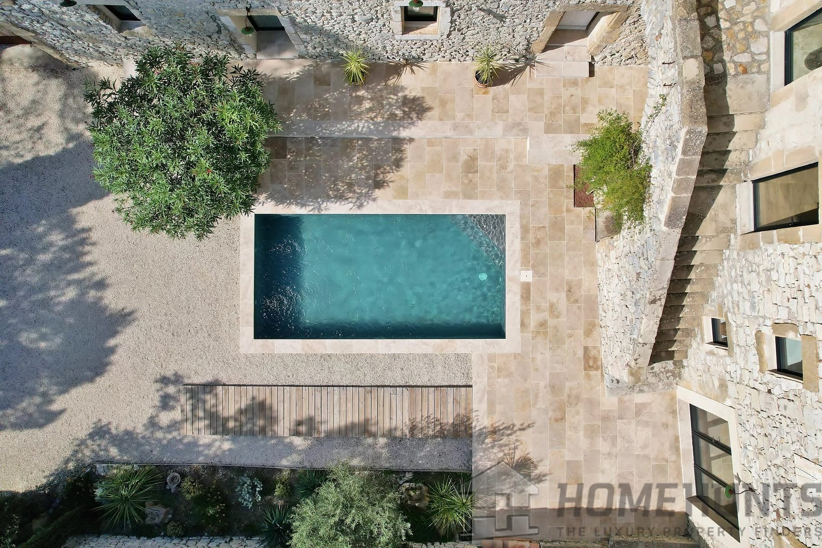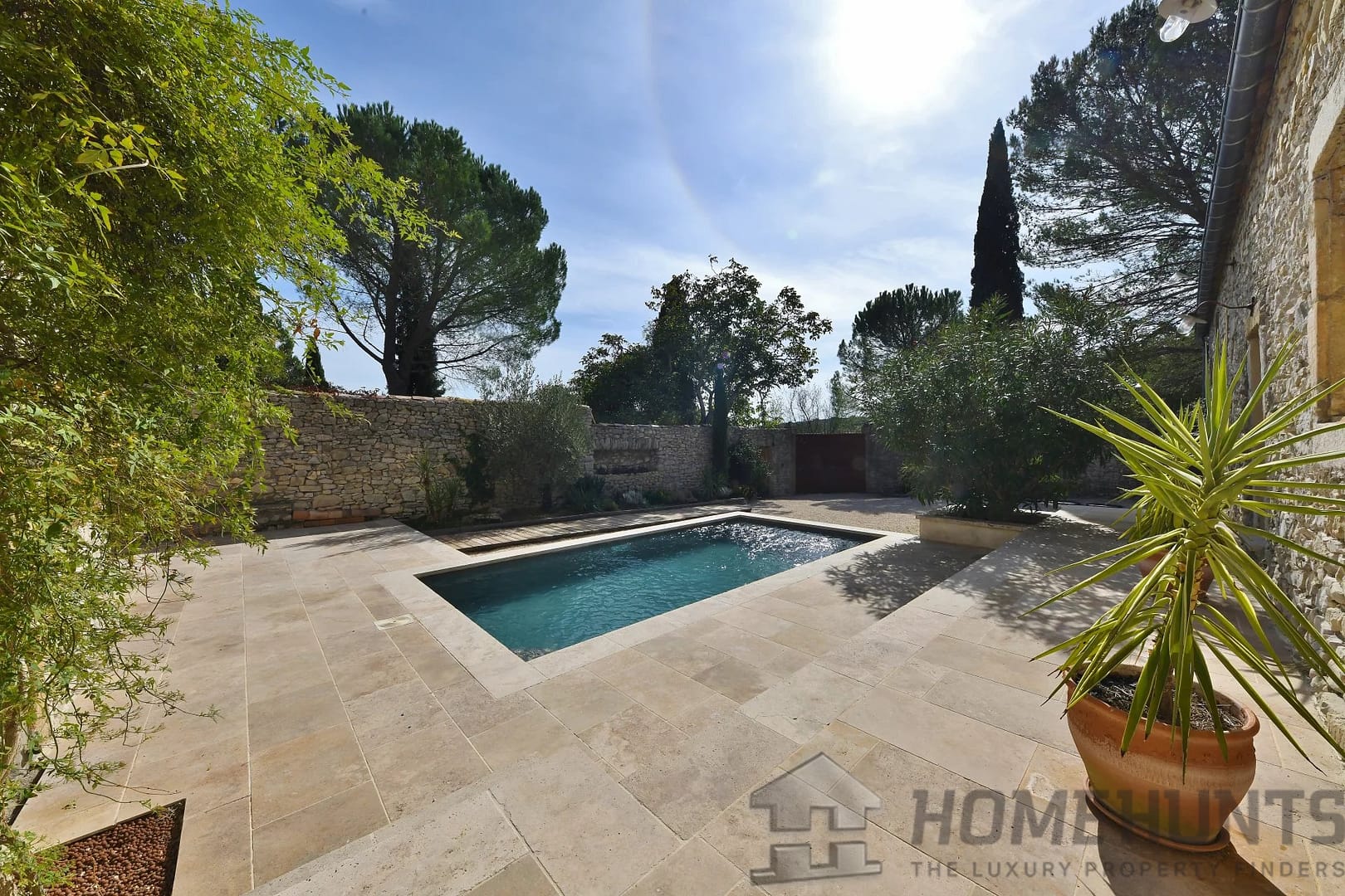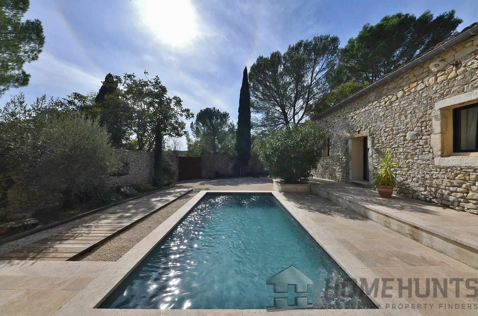 The enclosed garden with trees and a 6 x 3 metre swimming pool offers an intimate and pleasant outdoor space, ideal for relaxation.