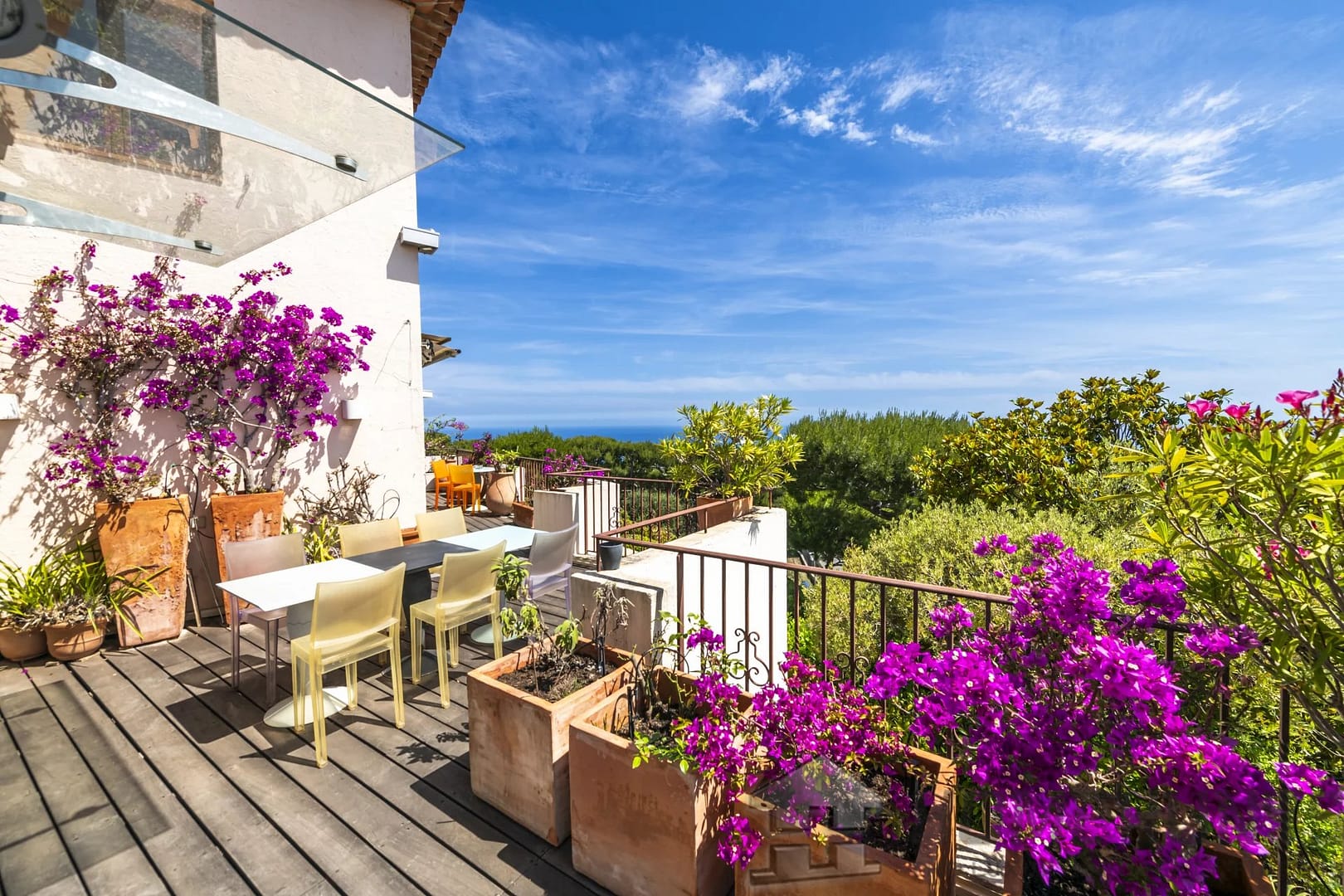 At the Col de Villefranche, in a small secure Provencal-style residence with a caretaker and a swimming pool, this modern duplex apartment of approximately 130 m2 features large terraces offering views of the bay of Villefranche-sur-Mer and the Baie des Anges.