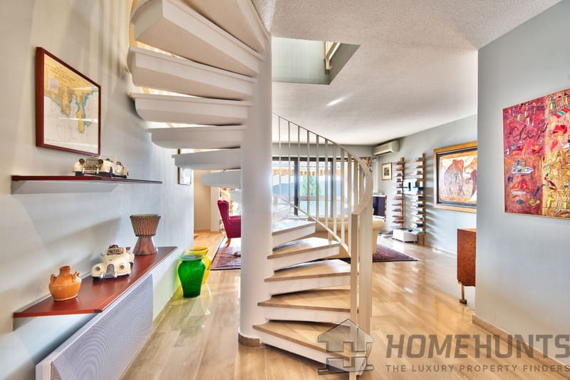 The rooftop, accessible by an exterior spiral staircase, is a true open-air living space: summer kitchen, dining area, sun loungers, and a 180 degrees view of the Mediterranean.
