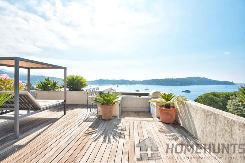 The entrance opens onto a bright living room, extended by a dining room. The separate, fully equipped kitchen blends seamlessly into the living space. A beautiful terrace offers breathtaking panoramic views of the sea and Saint-Jean-Cap-Ferrat. A storage area and guest toilet complete this level.
