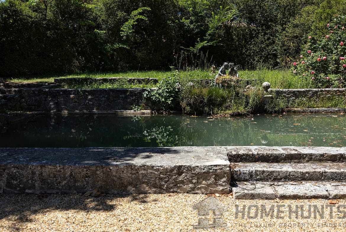 On the garden side, the estate has retained all of its adjoining outbuildings, its wells, its threshing floor, its dovecote, boxwood paths, gravelled flowerbeds, and greenery but also statues, a wood to the east of the mansion, a monumental entrance with a wrought iron gate, which unambiguously indicated the power and wealth of the masters of the place, a real Provencal tese and ponds (fed by a natural spring coming down from the Trevaresse), a wash house , and fountains.