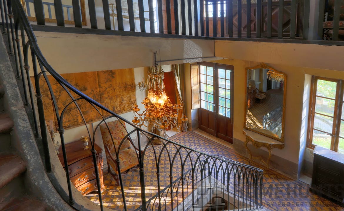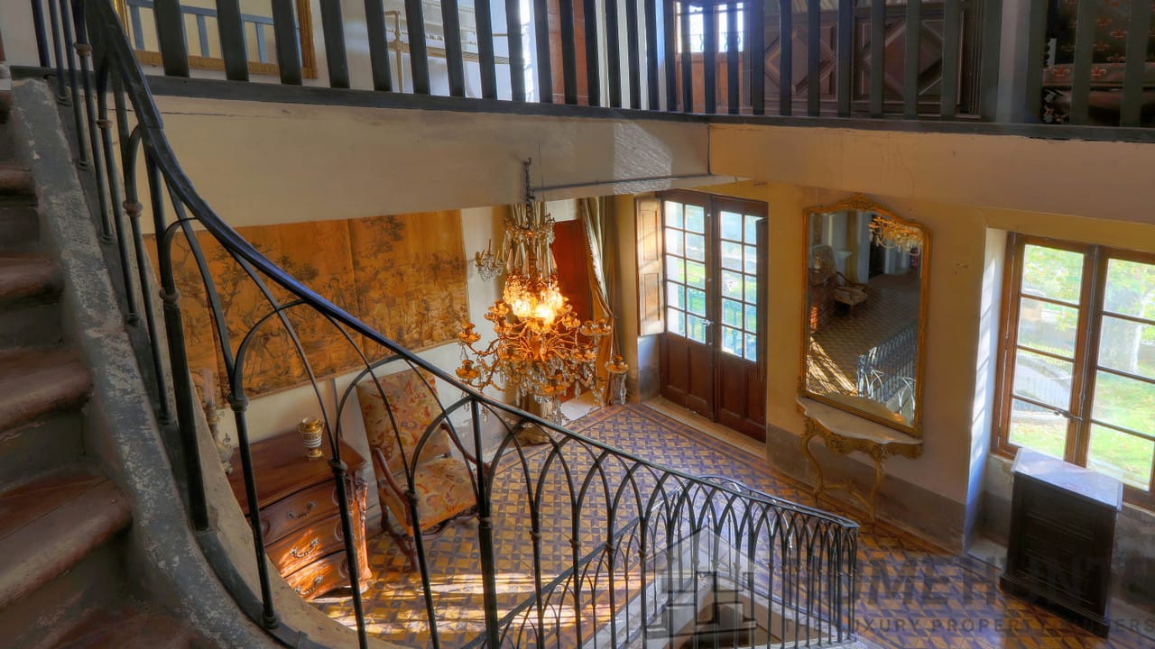 The property overlooks its land, backed by oak and pine woods, with a total area of about 84 hectares.
