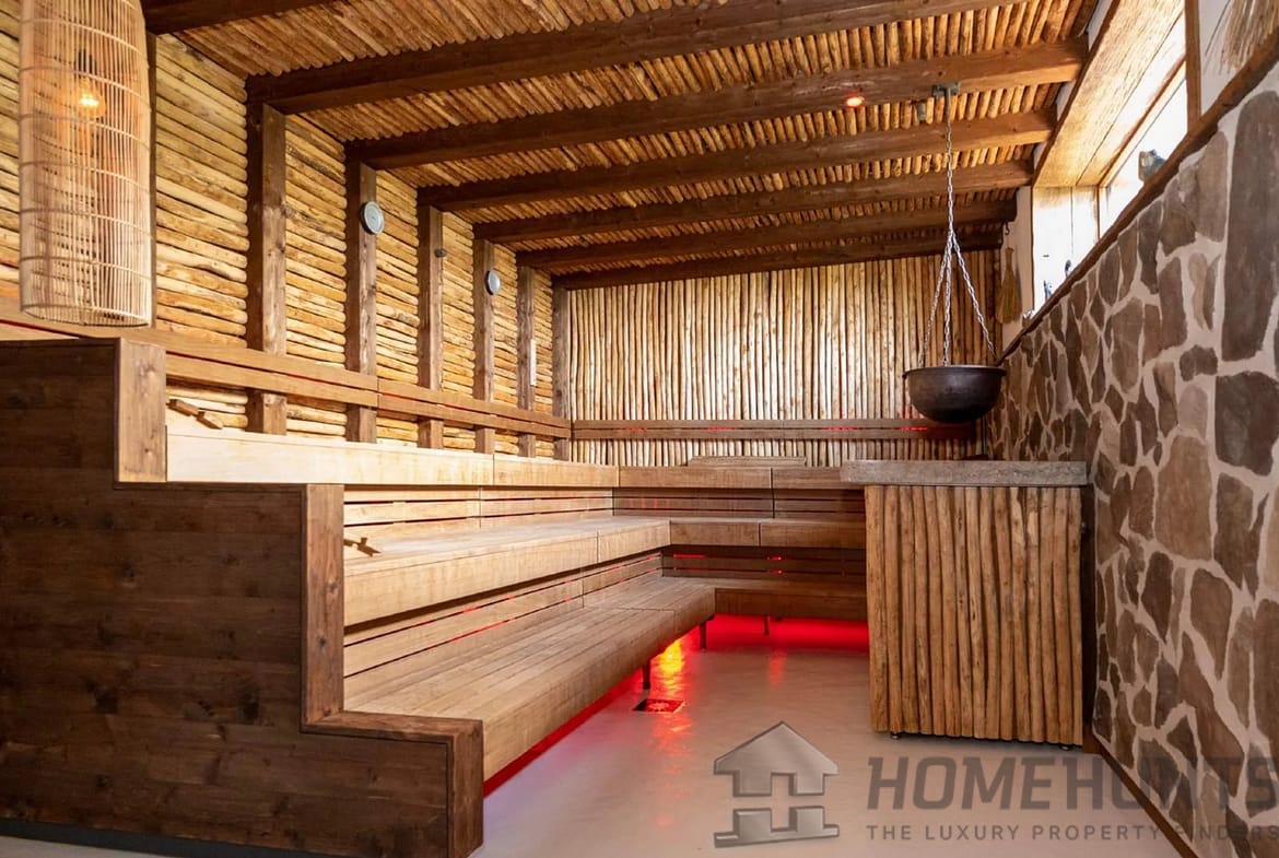 Extensive sports & leisure facilities include a gym, spa, multifunctional sports field (volleyball, football, basketball, tennis), a large swimming pool, a games room, and more. The spa & wellness area features a luxurious sauna, whirlpool, and cigar lounge, ensuring ultimate relaxation. One of its more unique features is a private chapel, ideal for weddings, spiritual reflection, or special celebrations.