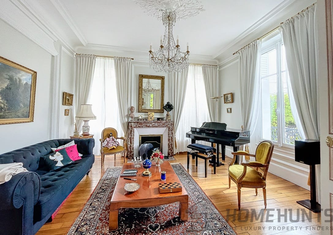 On the first floor, an entrance hall leads to two living rooms that exude elegance and refinement. Numerous windows and high ceilings highlight the warmth and authenticity of the moldings, woodwork, solid parquet flooring and period fireplaces.