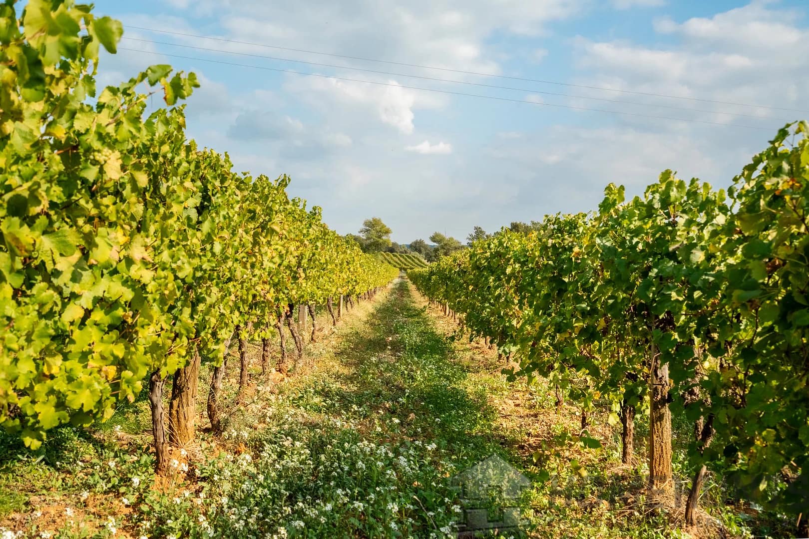 Additional infrastructure includes a wine cellar, agricultural buildings, and warehouses, offering full potential for a viticultural, olive-growing, or luxury hospitality project.