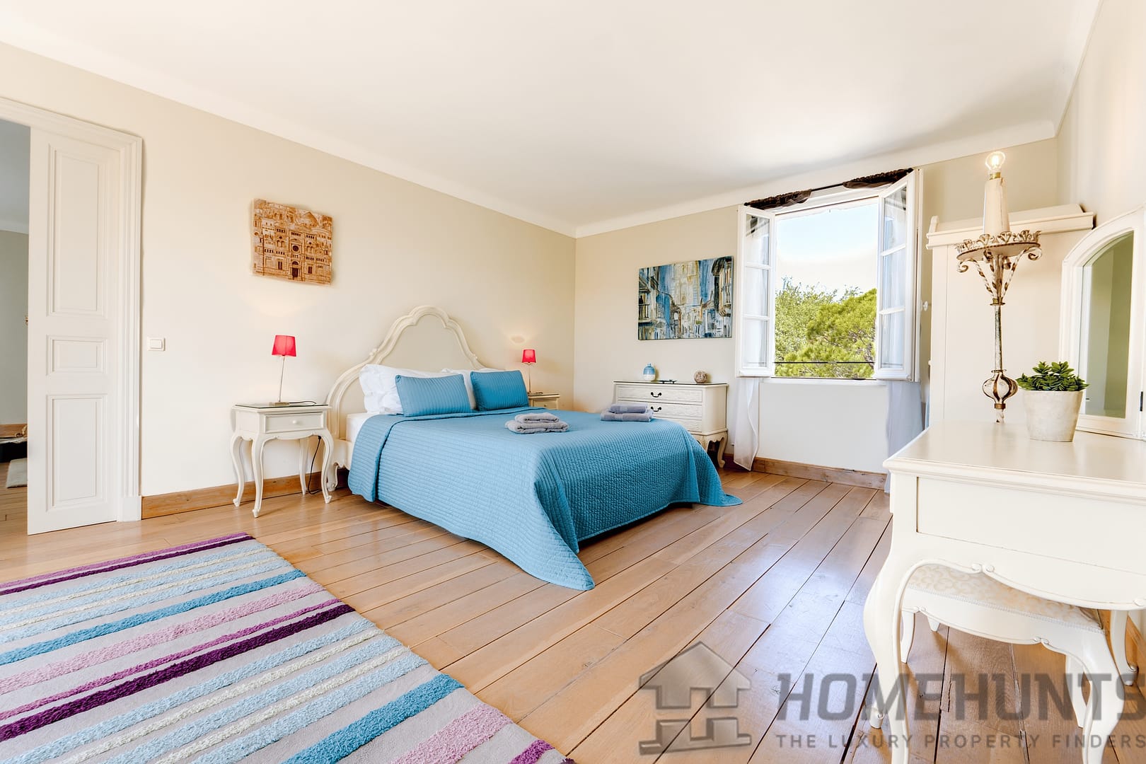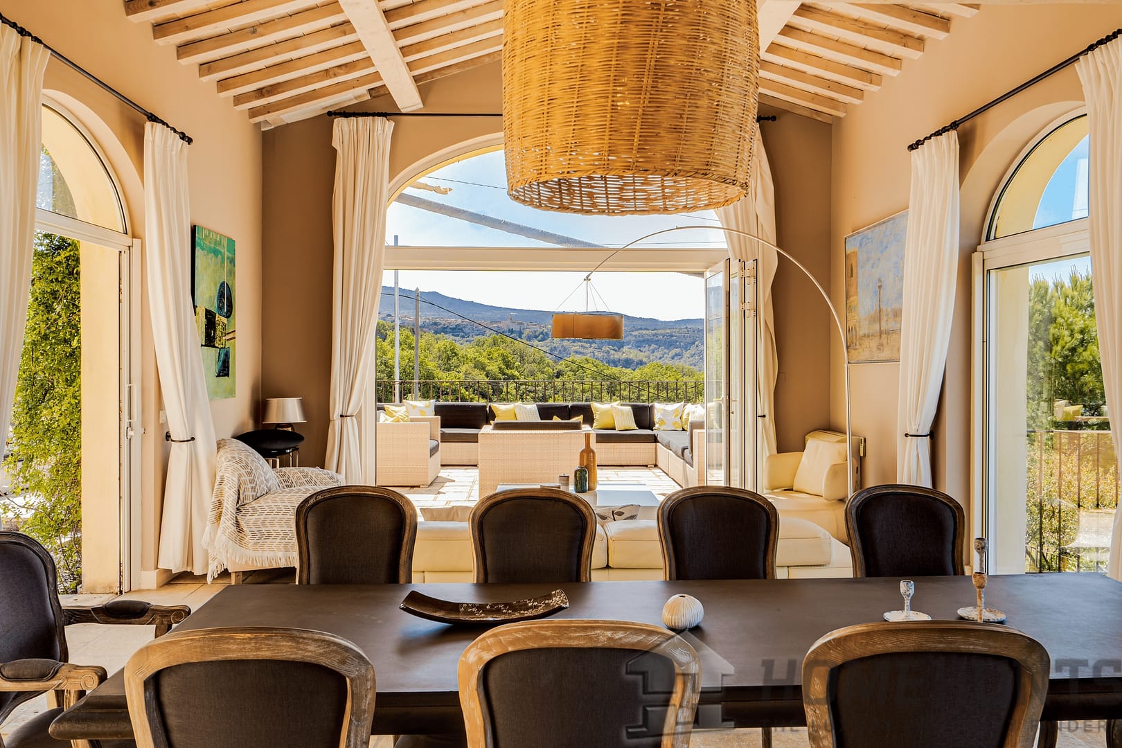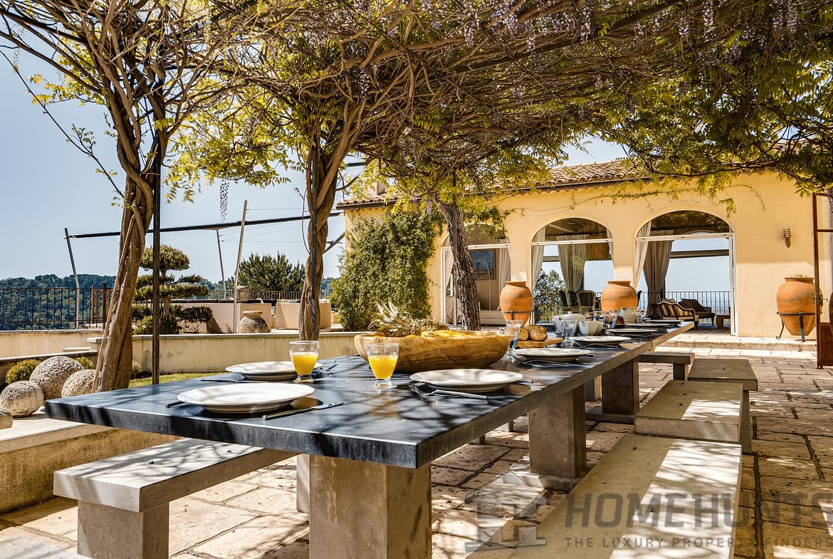 There is approximately 1,200m2 of light and bright living space in total with eleven bedrooms in the main part of the property (nine are ensuite) including two impressive master suites, plus a one bedroomed self-contained guardian house. There are several reception rooms, including a large provencal dining kitchen, formal dining room, double living room with open fireplace and a wonderful, panoramic sunroom that takes in the stunning views. All reception rooms open onto the landscaped terraces, gardens and pool area.