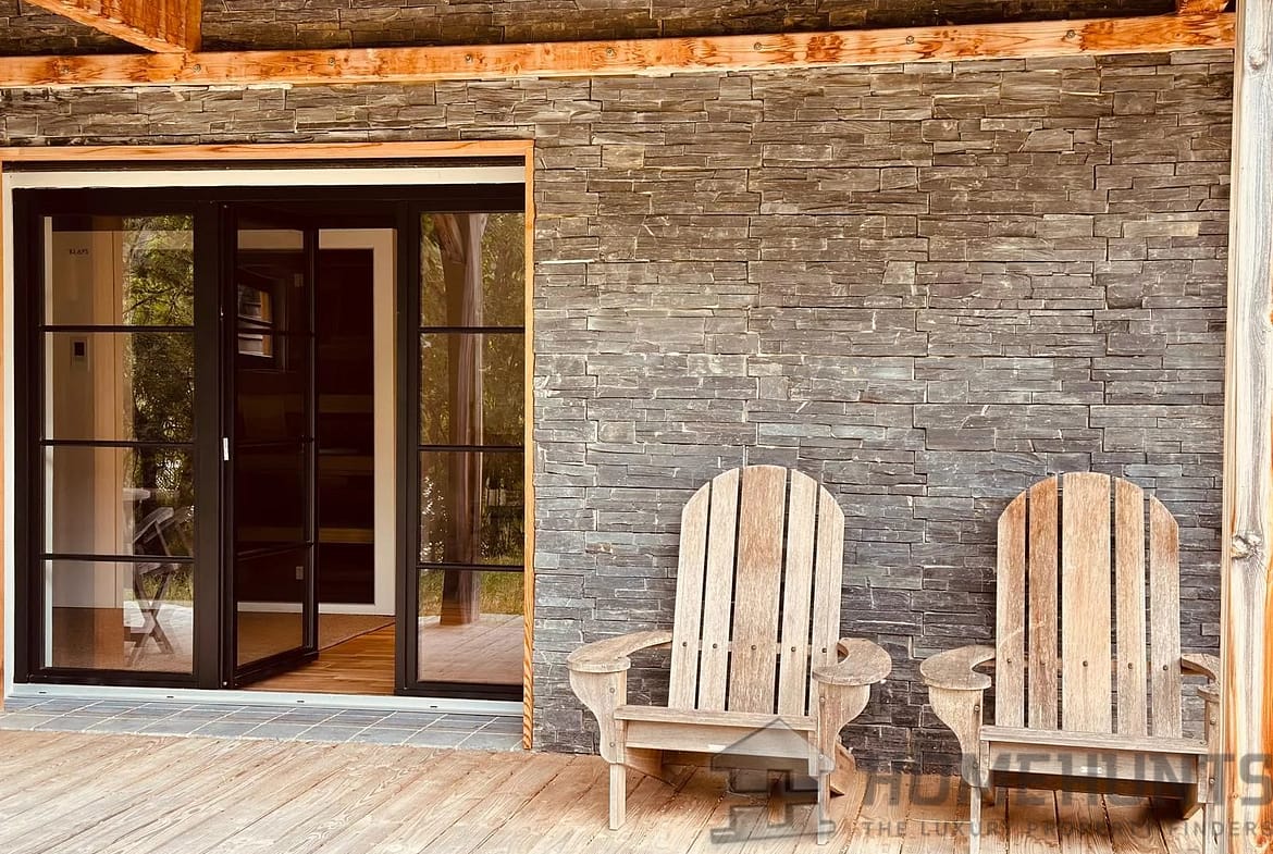 The ground floor offers an open reception area. The en-suite bedrooms offer absolute comfort, with custom-made beds and exclusive decorative elements. Upstairs, the mezzanine serves as an additional relaxation area, featuring a reading nook and panoramic views that enhance the beauty of the surroundings.