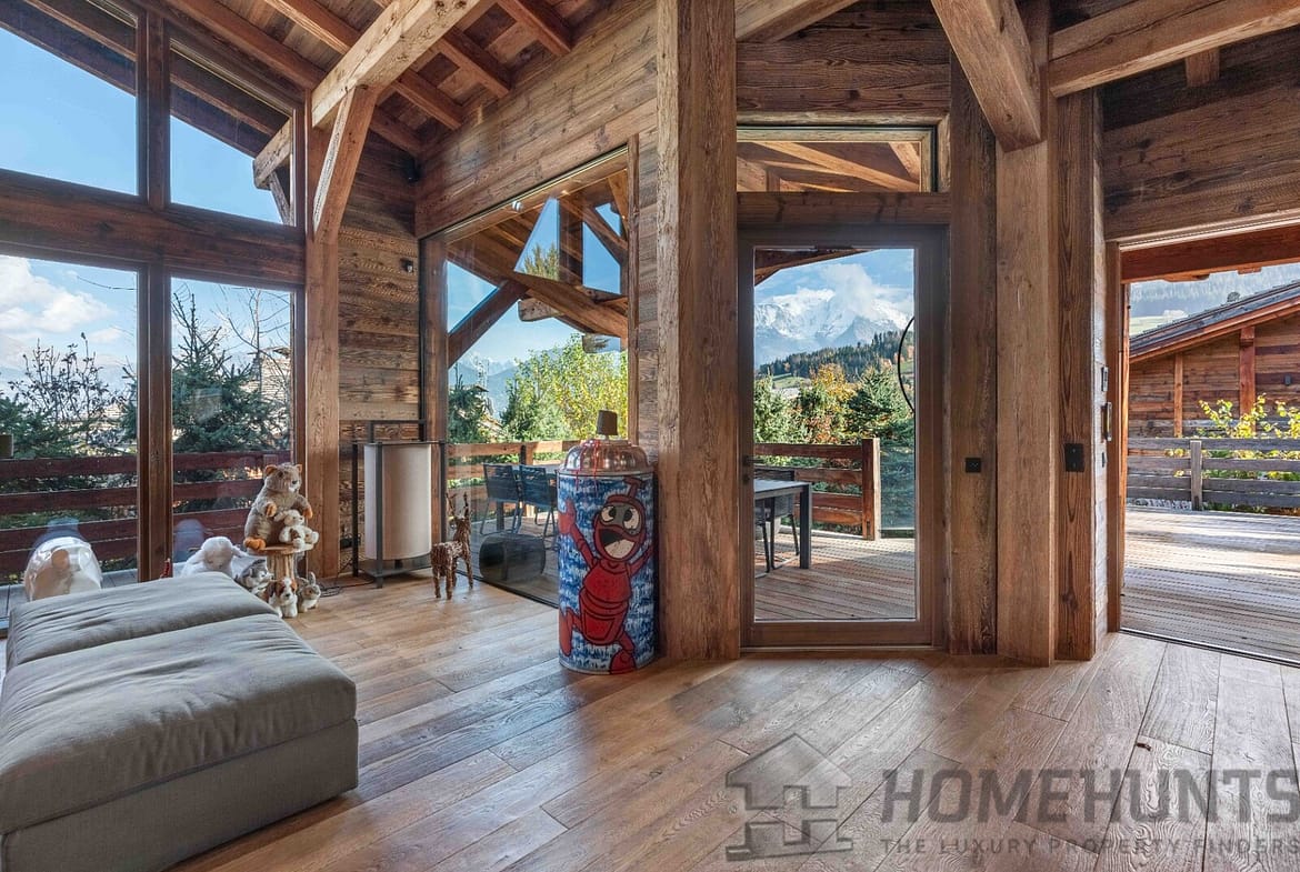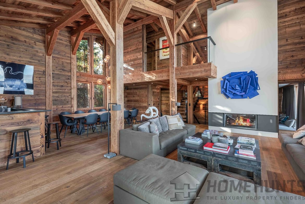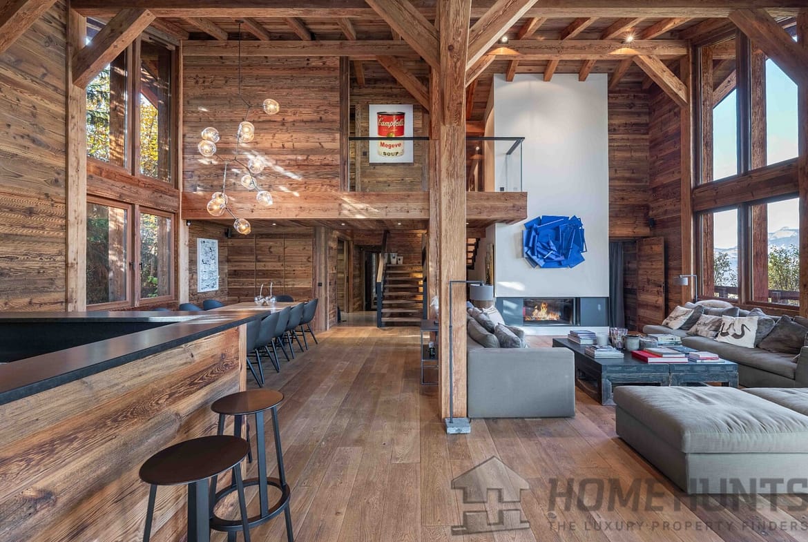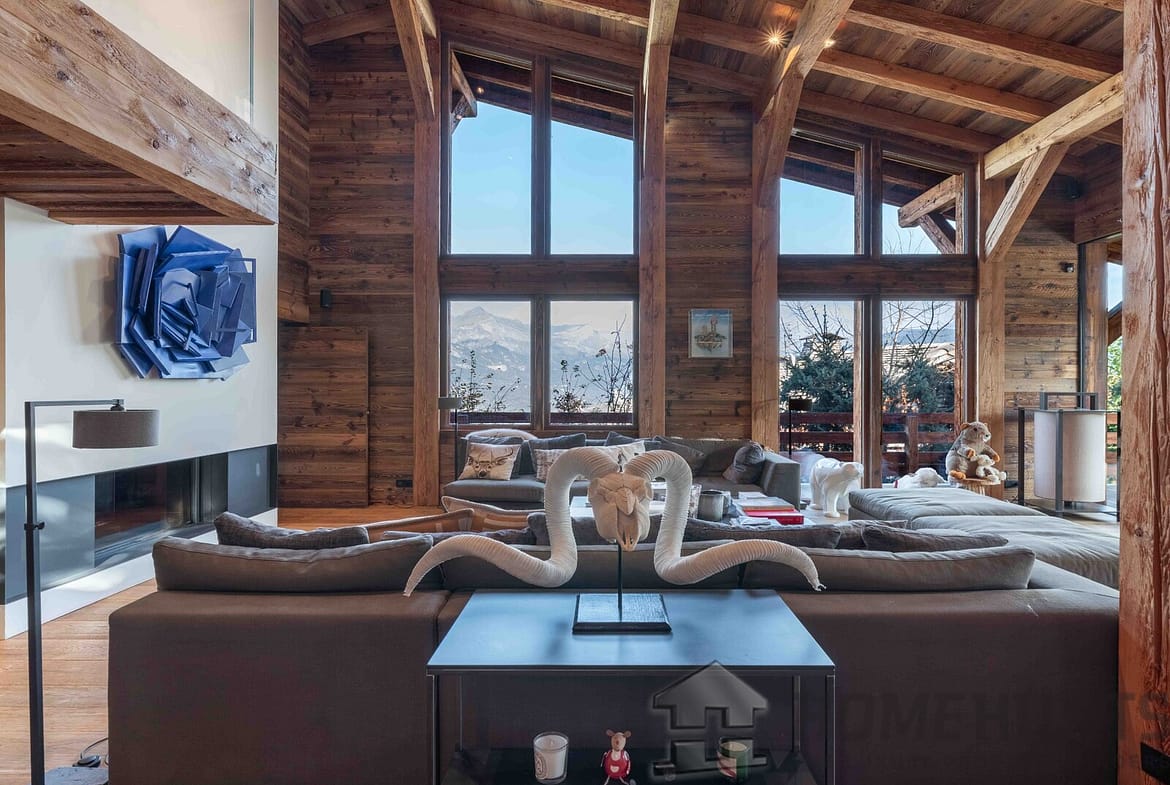 – Cathedral living room with fireplace and Mont Blanc views