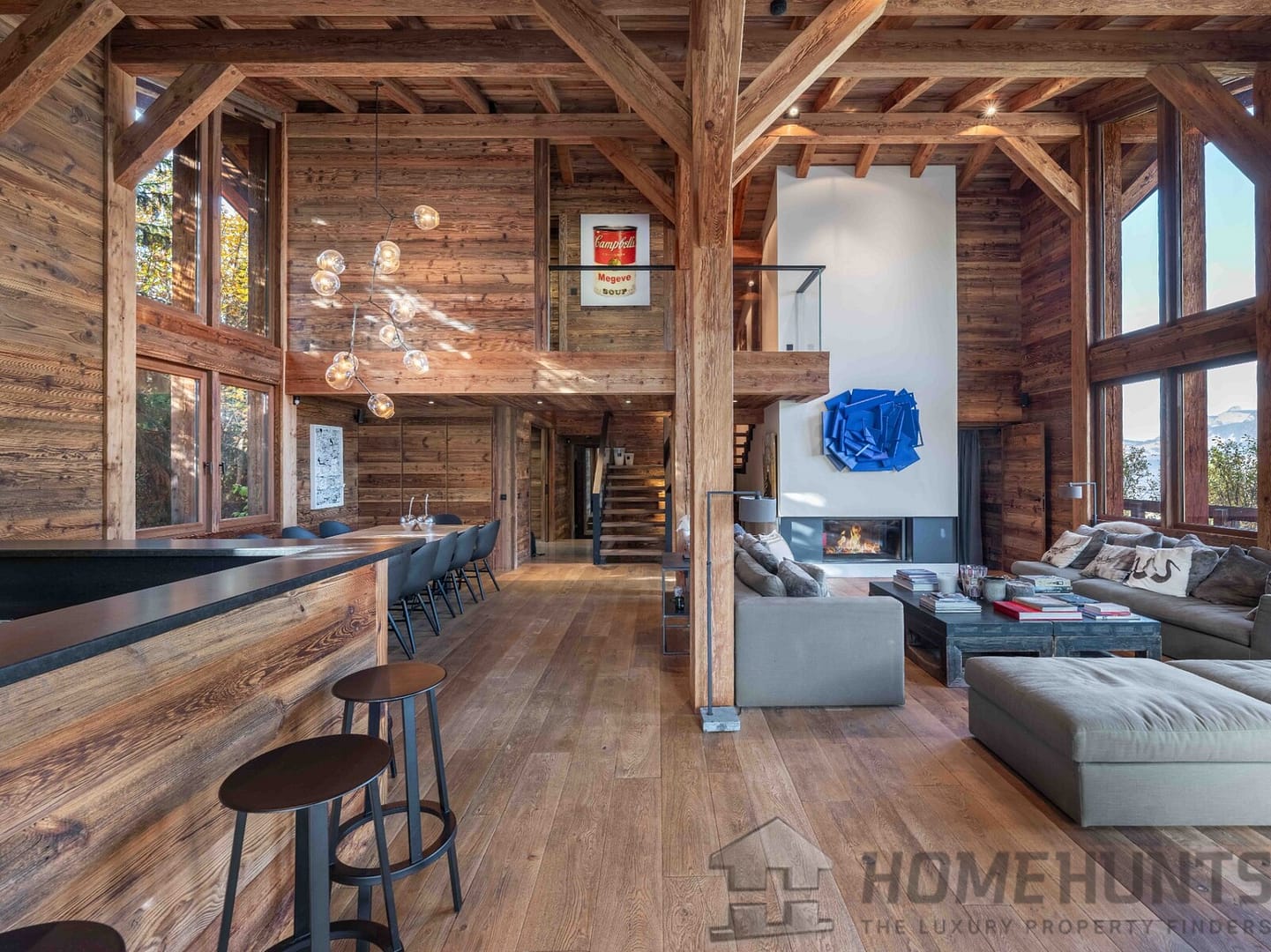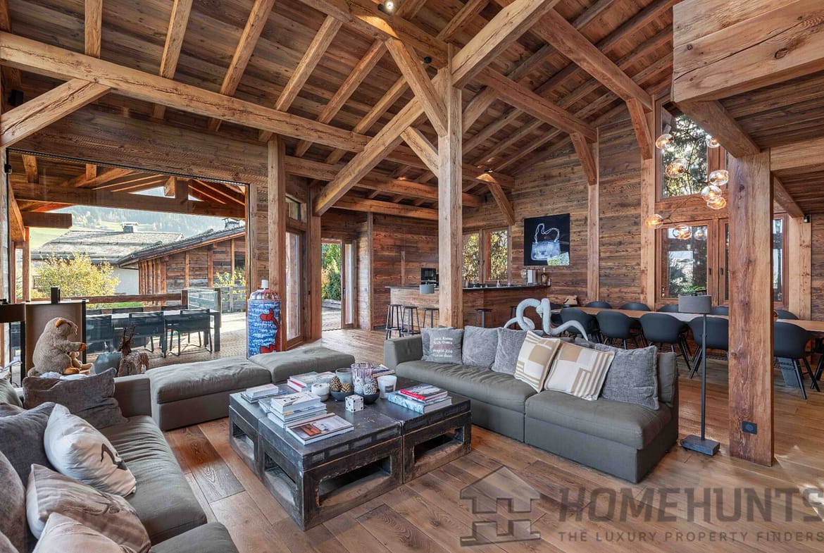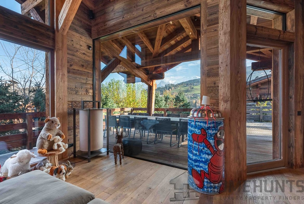 – Cathedral living room with fireplace and Mont Blanc views