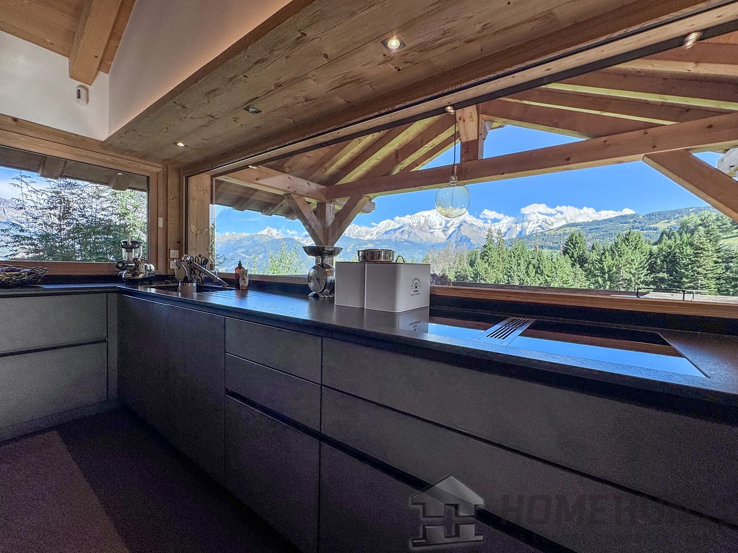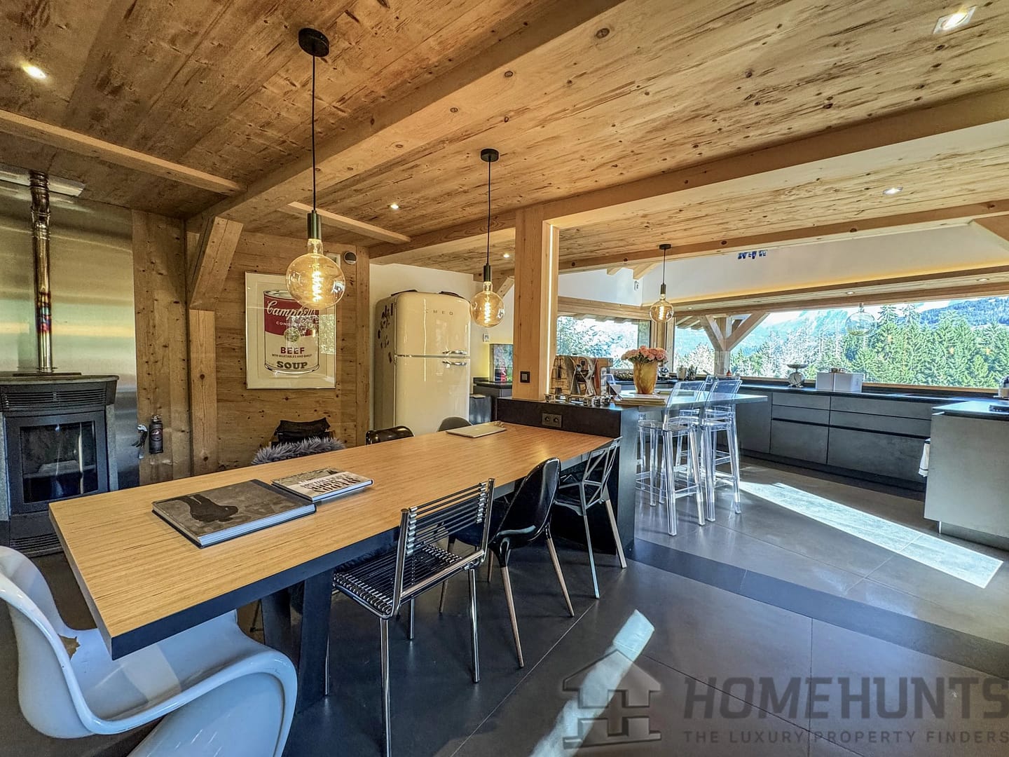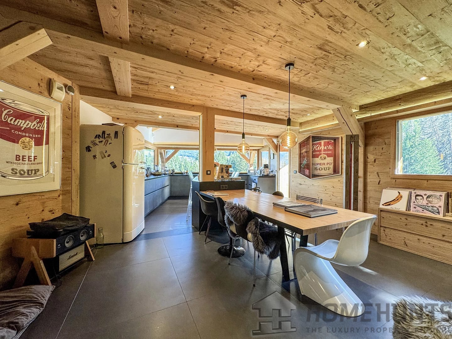 The chalet features a spacious open-plan living area with a fully equipped kitchen, creating a warm and welcoming environment that opens seamlessly onto multiple terraces, all framing breathtaking views of the Mont-Blanc massif.