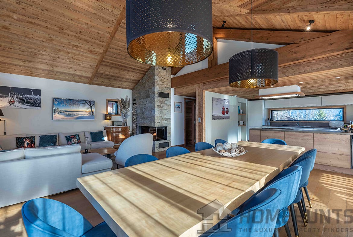 The spacious, bright, south-west facing living room opens onto unobstructed views. Its central fireplace creates a warm atmosphere, ideal for gathering after a day on the slopes.