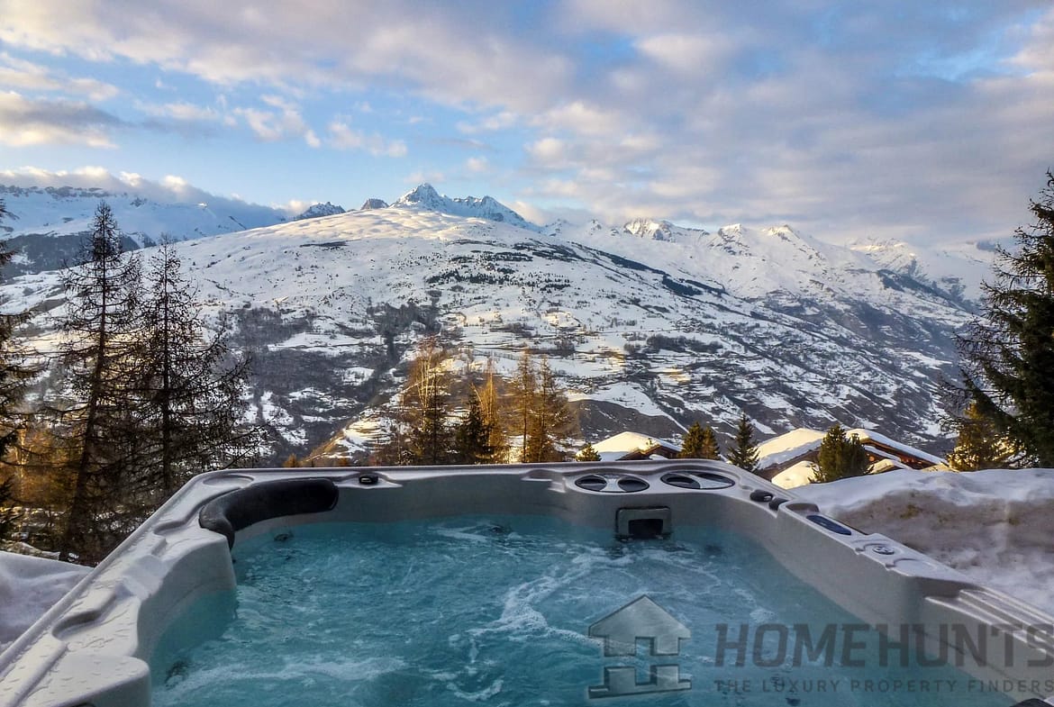 The beautiful terraces come with uninterrupted mountain views. Just take a look a the view from the outdoor jacuzzi.