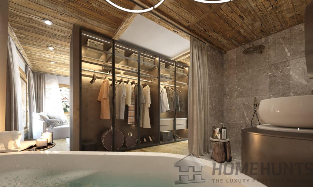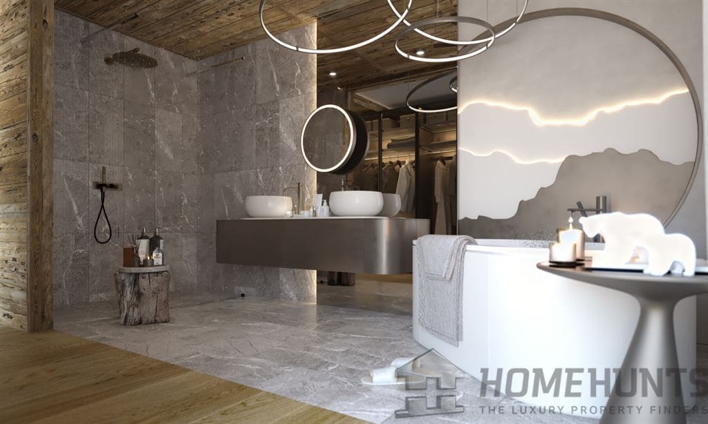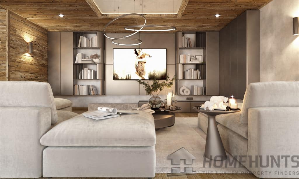 The centre piece of the chalet is a spacious living room of over 130 m2, with large windows and a 48 m2 terrace. The lower level features a wellness area with a 50 m2 sun terrace, Jacuzzi and sauna. The two master suites are particularly spacious, accompanied by four bedrooms with en suite bathrooms.