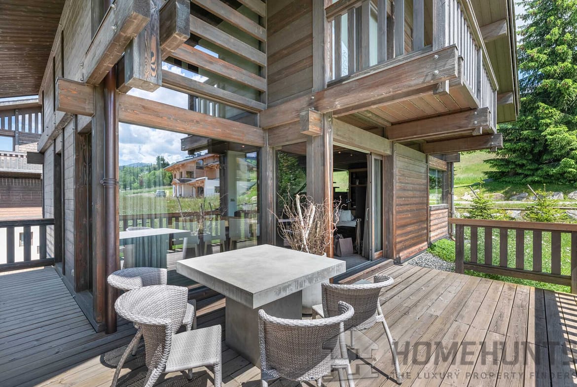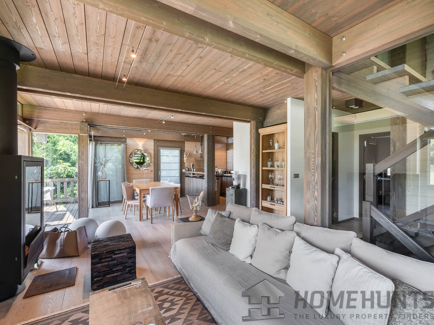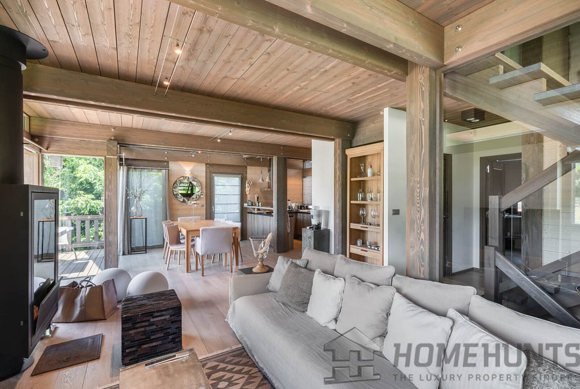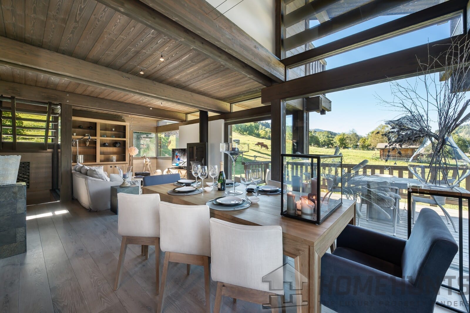 A recent construction, this chalet embraces the natural landscape with large picture windows that frame the surrounding peaks like living art. Spread across three levels, it features light-filled living spaces, refined interiors, and a warm, family-friendly atmosphere.