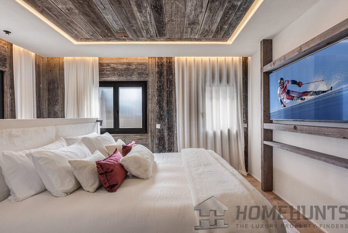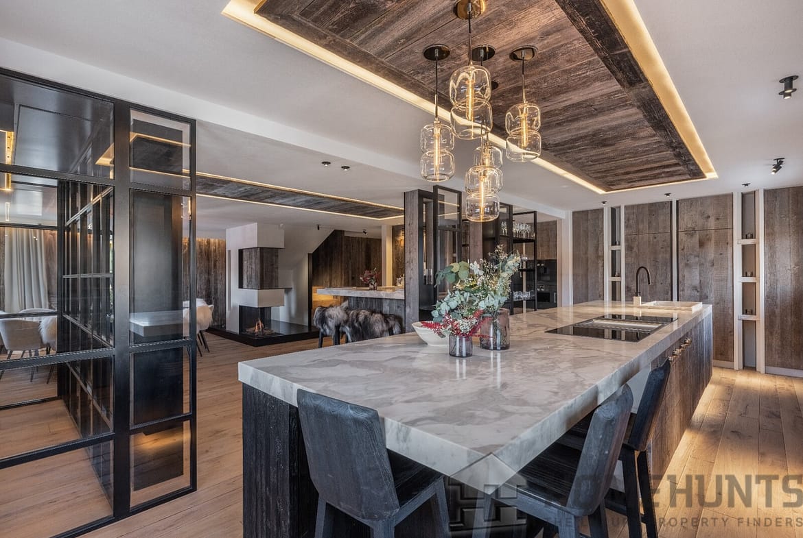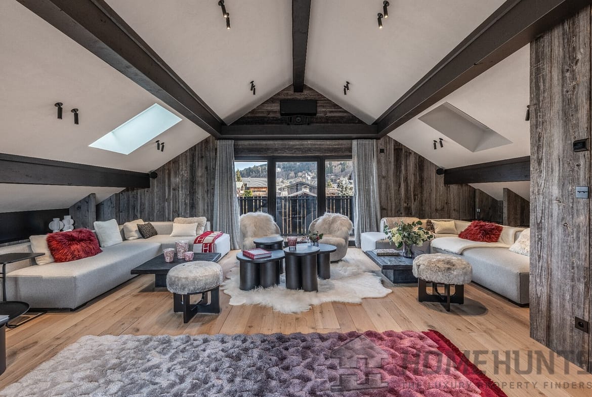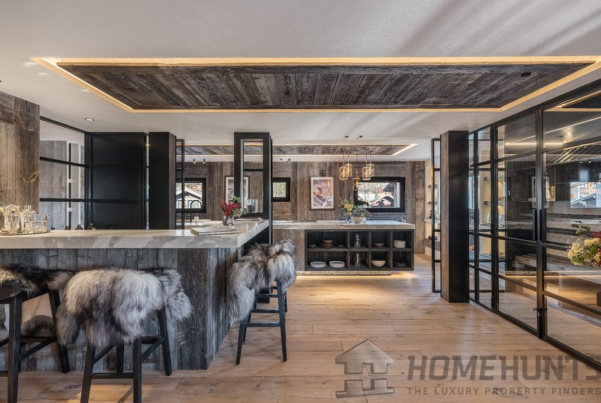 The property features six generously proportioned en suite bedrooms, all thoughtfully designed for privacy and relaxation, including a spectacular master suite with private lounge and balcony access. At the heart of the chalet, a soaring reception area and open-plan kitchen with bar create the perfect setting for both intimate gatherings and grand entertaining.