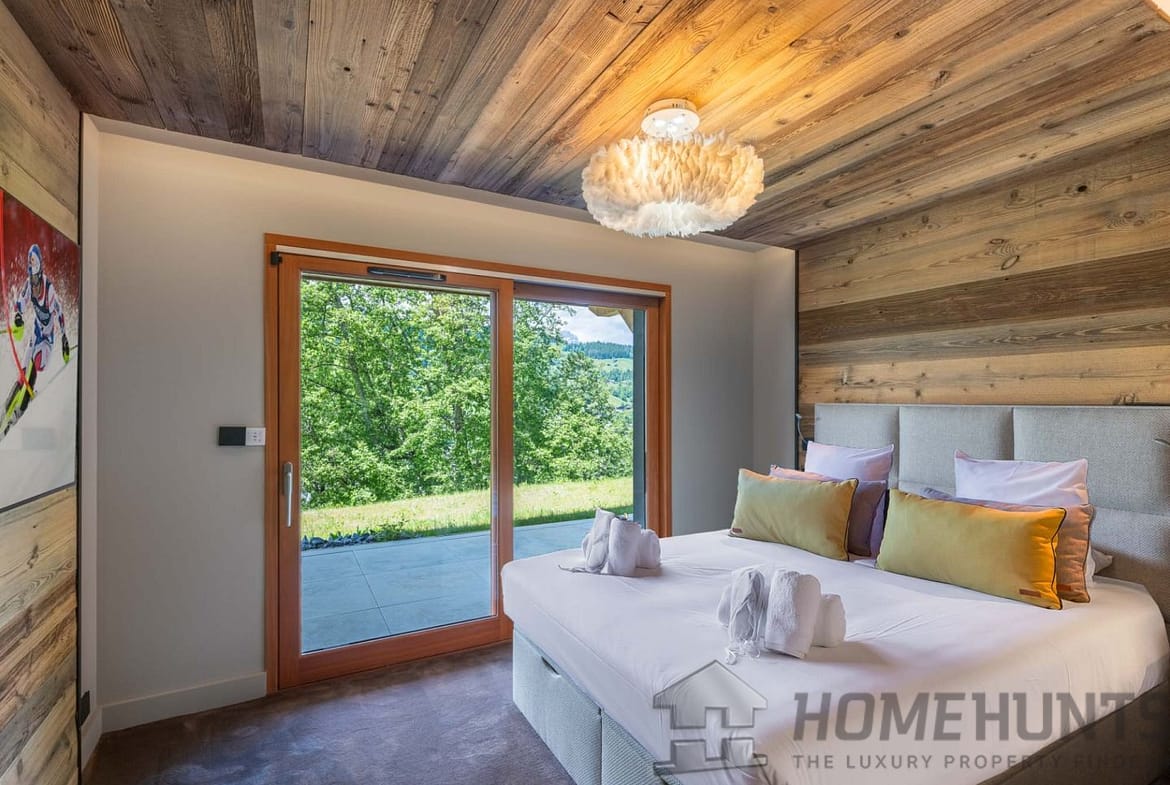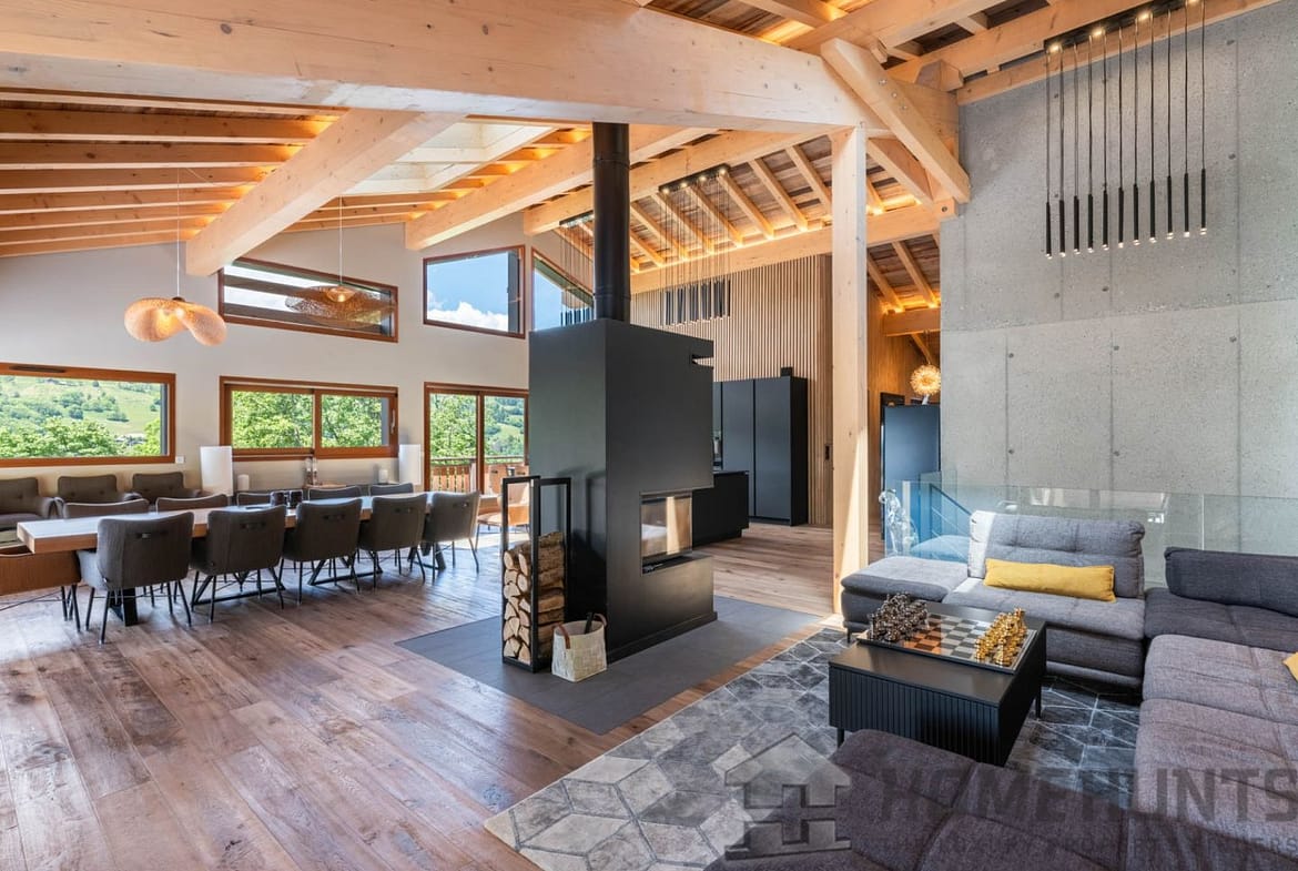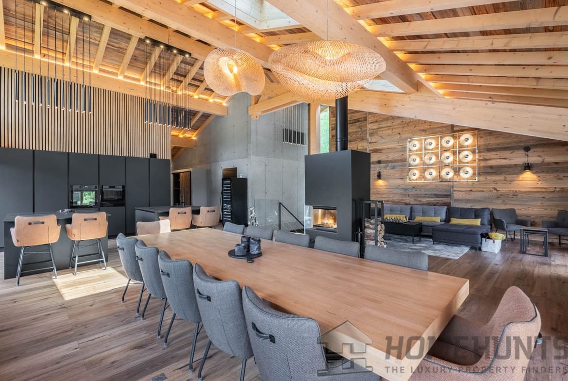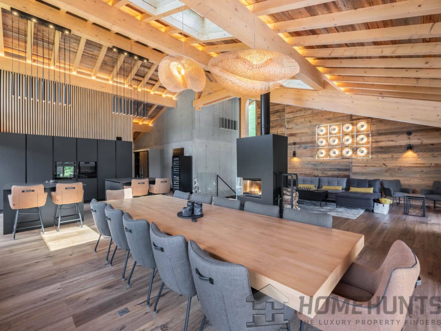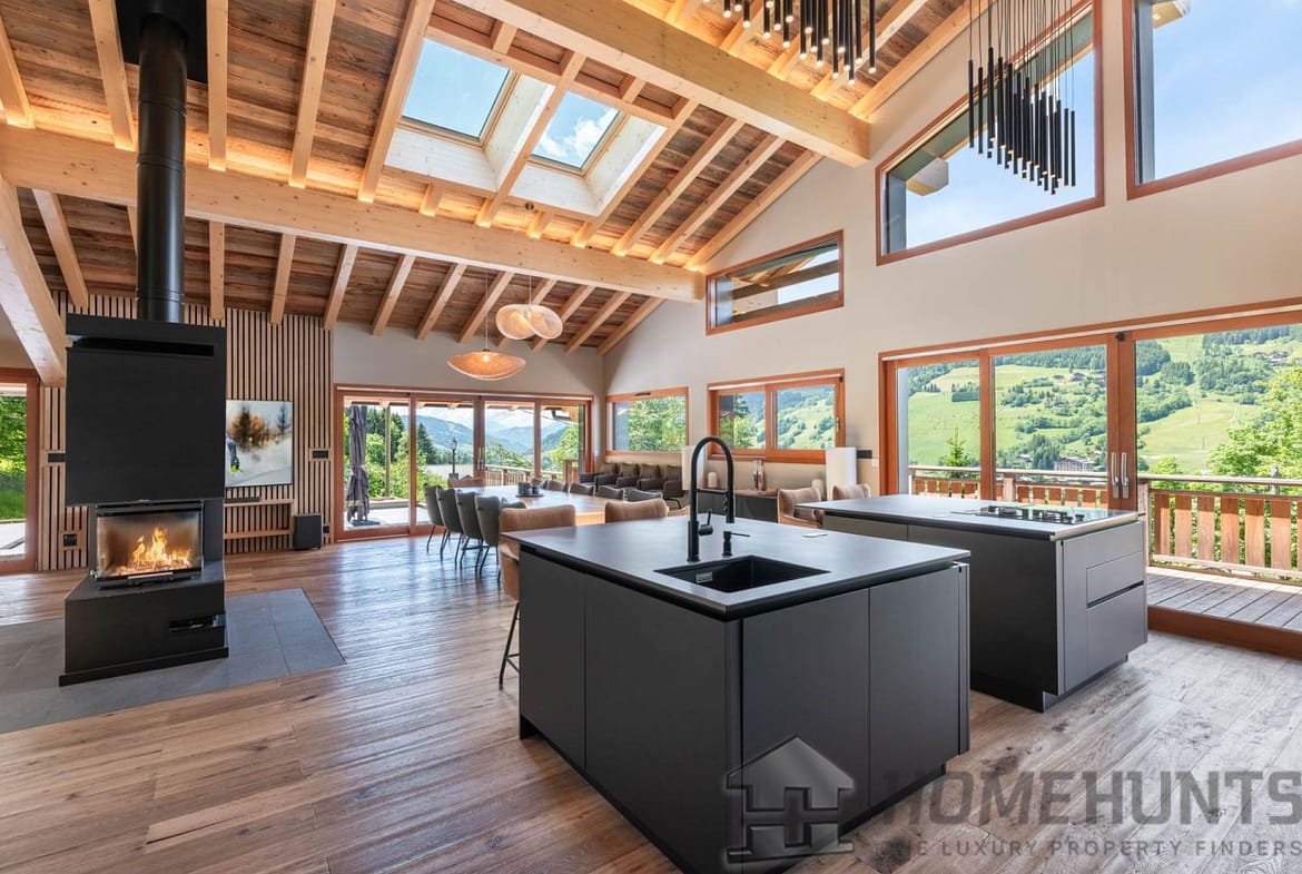 The chalet has five double bedrooms with en-suite bathrooms, a children’s bedroom sleeping four, and a light-filled living area comprising a lounge, dining room and contemporary kitchen. A central glazed fireplace creates a warm and welcoming atmosphere, while a large balcony offers panoramic views of Le Jaillet and the village of Megeve.