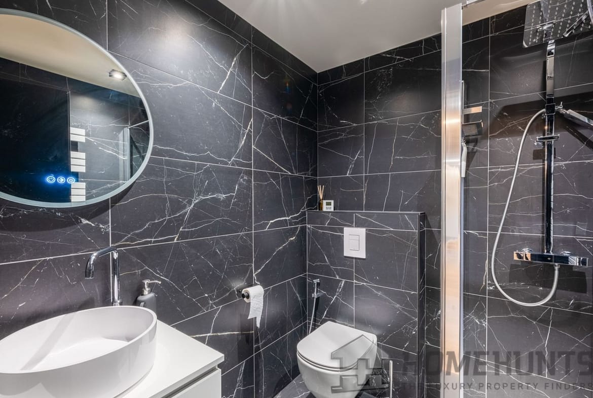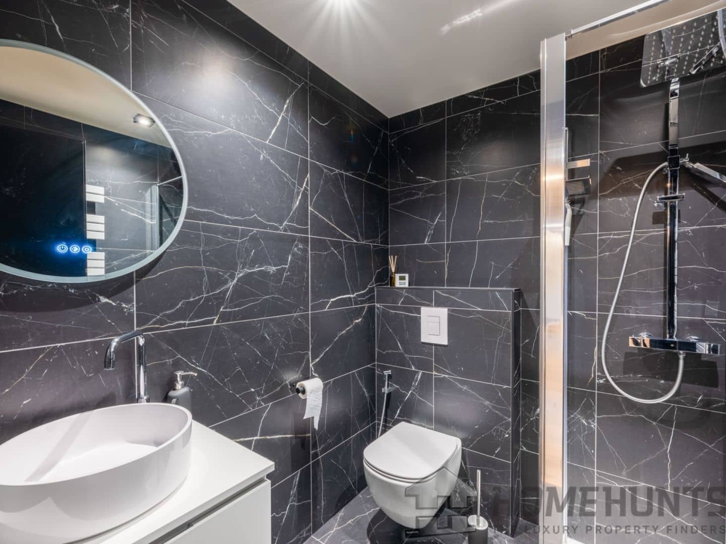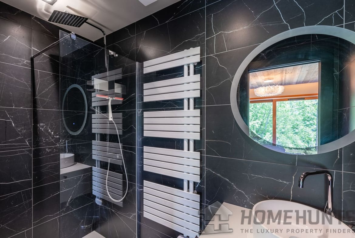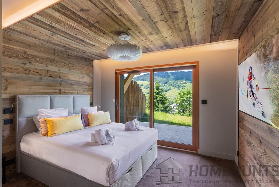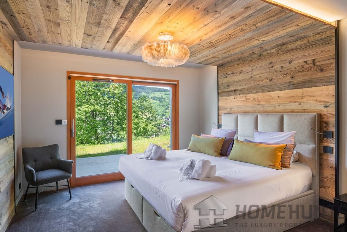 The chalet has five double bedrooms with en-suite bathrooms, a children’s bedroom sleeping four, and a light-filled living area comprising a lounge, dining room and contemporary kitchen. A central glazed fireplace creates a warm and welcoming atmosphere, while a large balcony offers panoramic views of Le Jaillet and the village of Megeve.