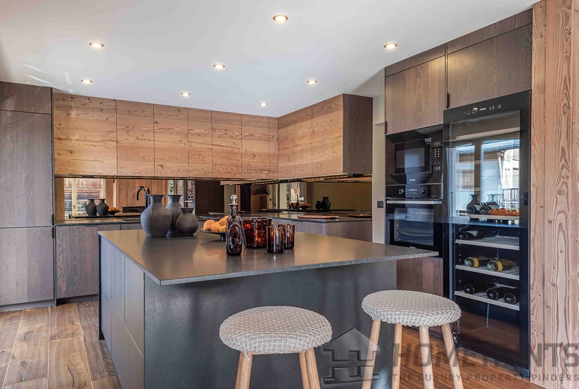 This level also includes a perfectly equipped ski room and a discreet and functional laundry room. The main floor reveals a vast, warm living space centered around a living room with a fireplace, a fully equipped open kitchen, and a large balcony.