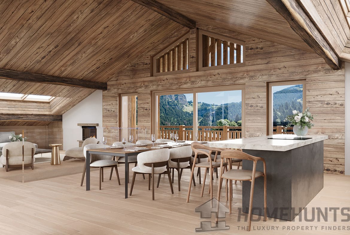 Facing south, the chalet offers unobstructed and breathtaking views of the surrounding mountains. The chalet comprises five en-suite bedrooms, a living area with a fireplace under a timbered roof with glass windows, offering optimal light.